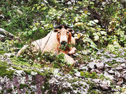 当天9时许,该公园工作人员田玉露巡护至太公石船景点附近时,发现一头毛色淡黄、体格健壮的羚牛正在河对面巨石上休憩。她立刻拿出手机记录下这一幕。“当时天空下着毛毛细雨,它正悠闲地休憩,发现我后毫无惧色,在原地停留了很久才慢慢离开往坡上走去,边走边觅食。”田玉露说。