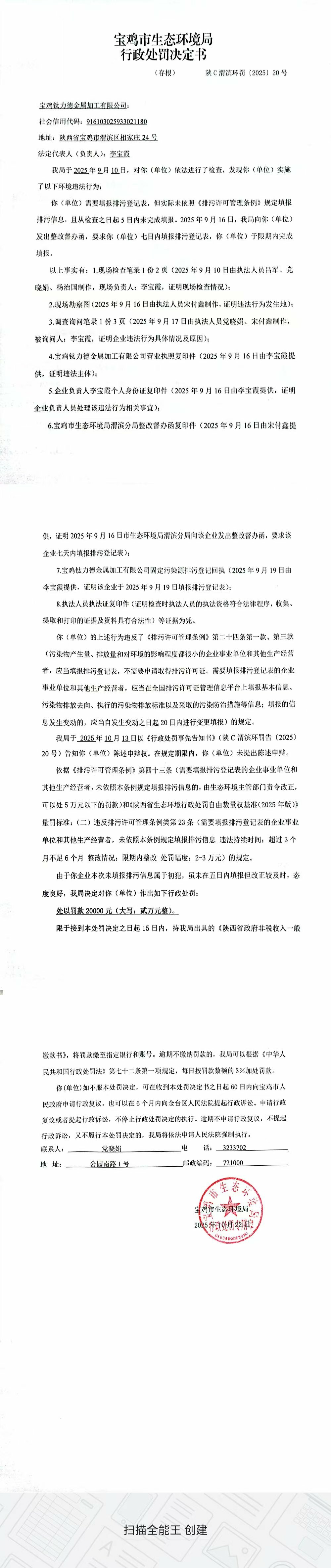 宝鸡市生态环境局行政处罚决定书(陕C渭滨环罚〔2025〕20号)