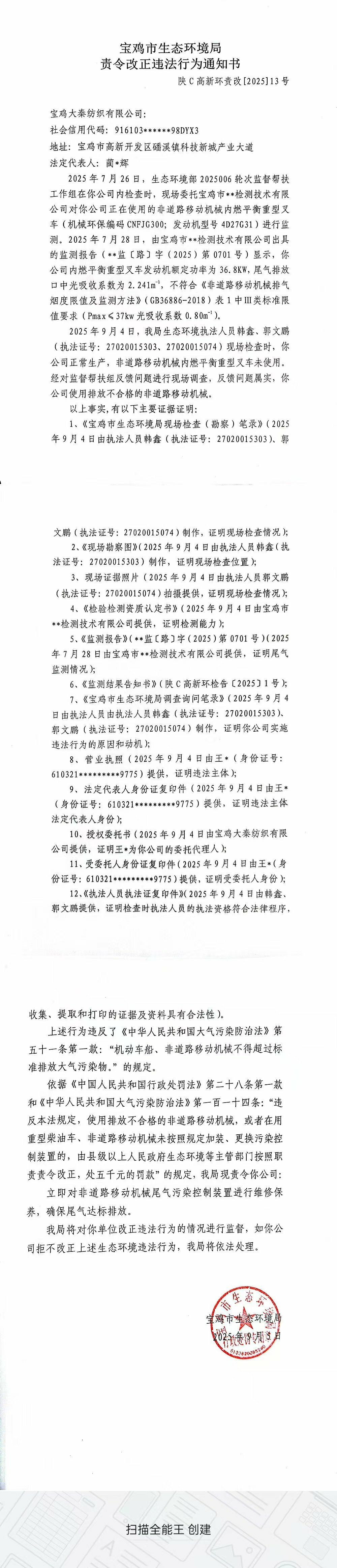 宝鸡市生态环境局责令改正违法行为决定书(陕C高新环责改〔2025〕13号)