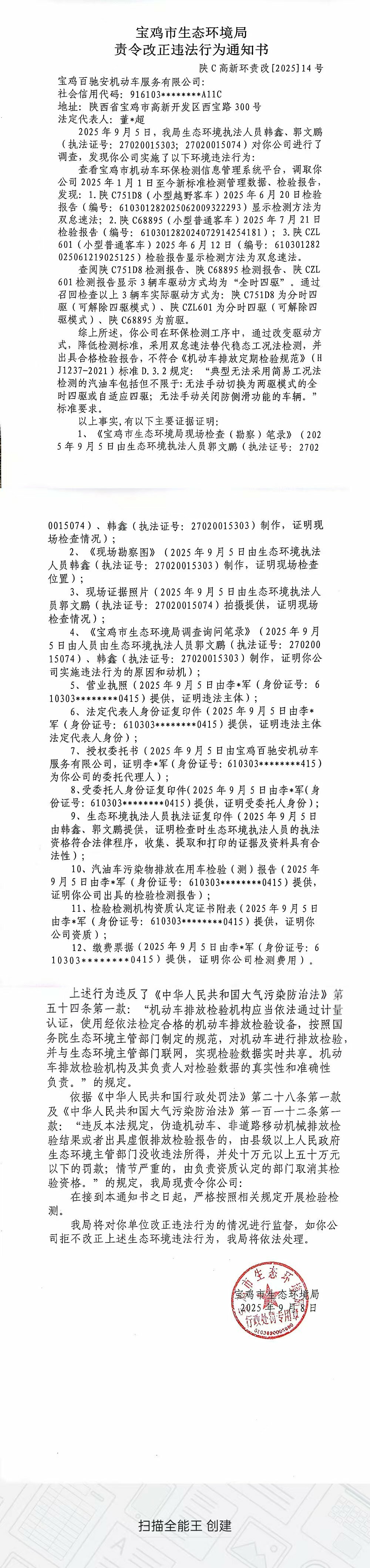 宝鸡市生态环境局责令改正违法行为决定书(陕C高新环责改〔2025〕14号)