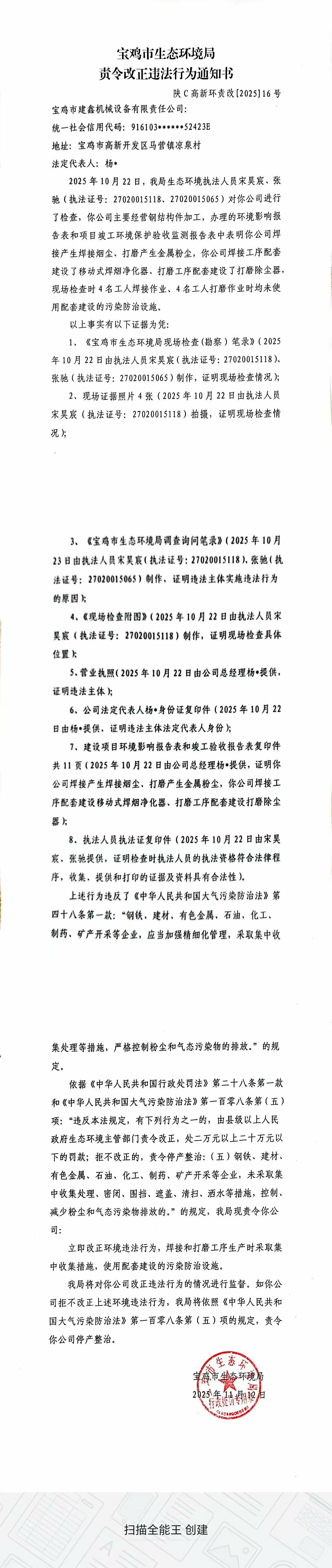 宝鸡市生态环境局责令改正违法行为决定书(陕C高新环责改〔2025〕16号)