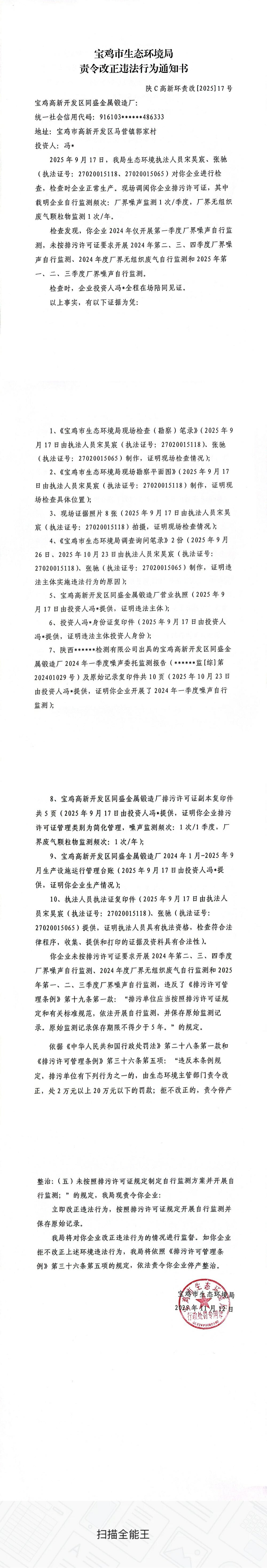 宝鸡市生态环境局责令改正违法行为决定书(陕C高新环责改〔2025〕17号)