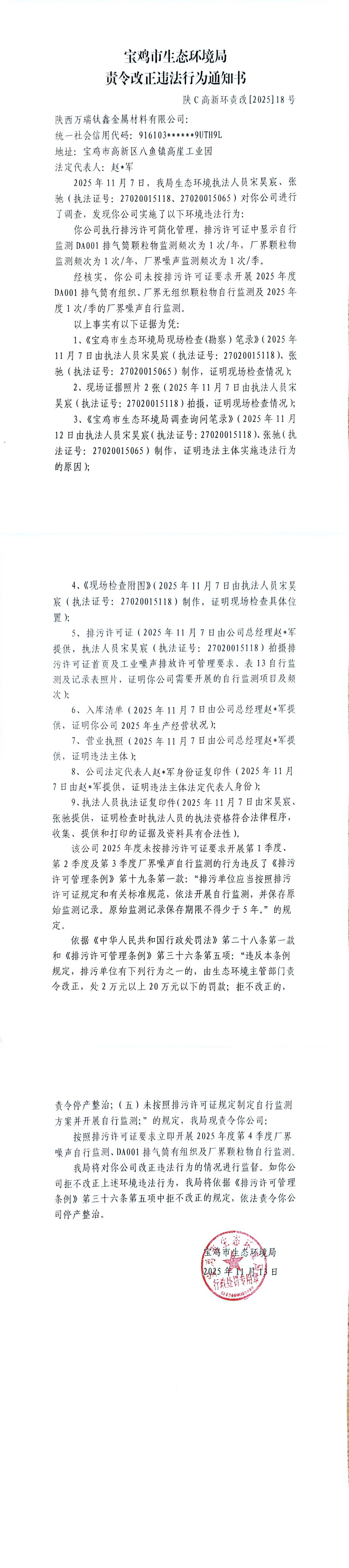 宝鸡市生态环境局责令改正违法行为决定书(陕C高新环责改〔2025〕18号)