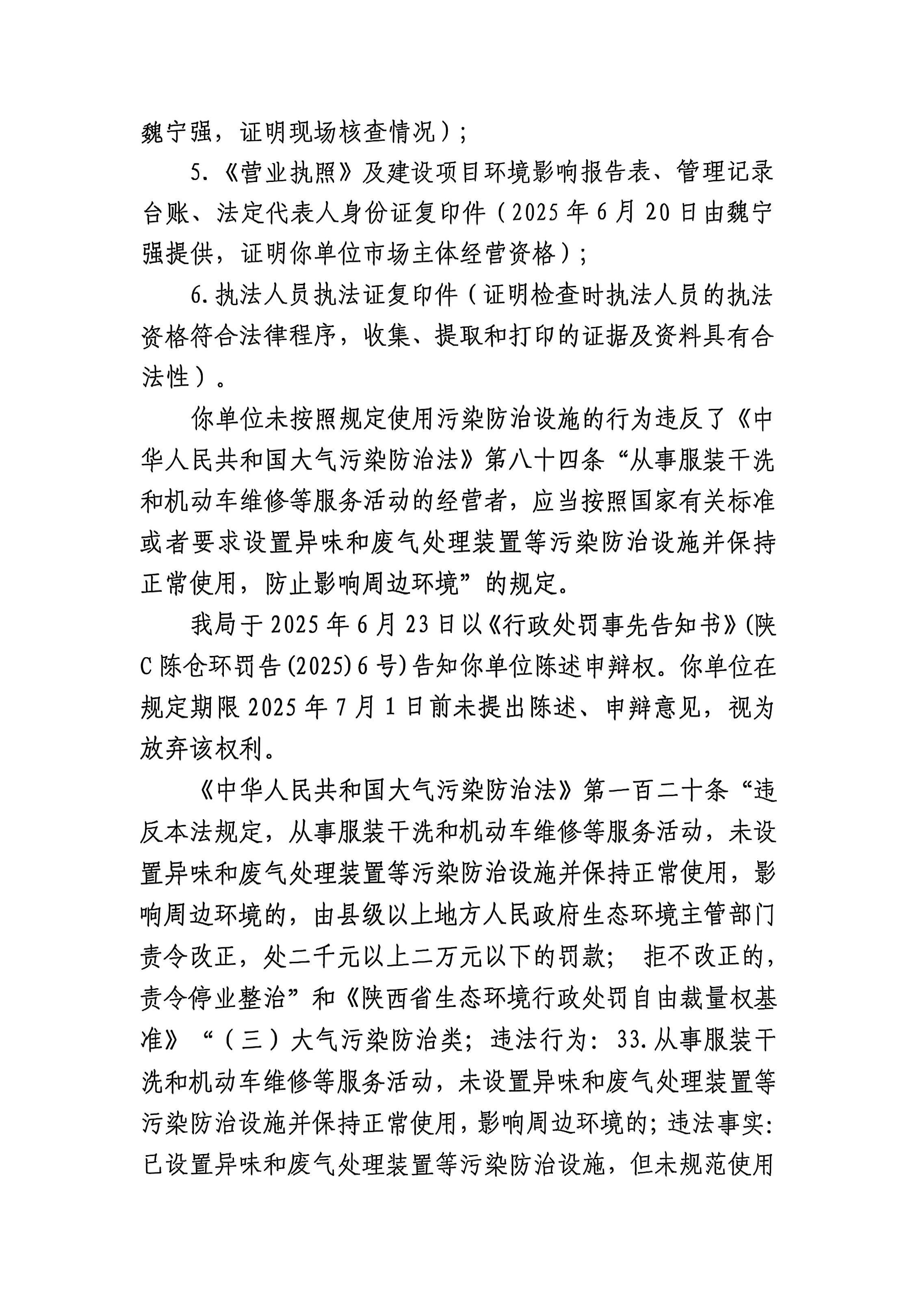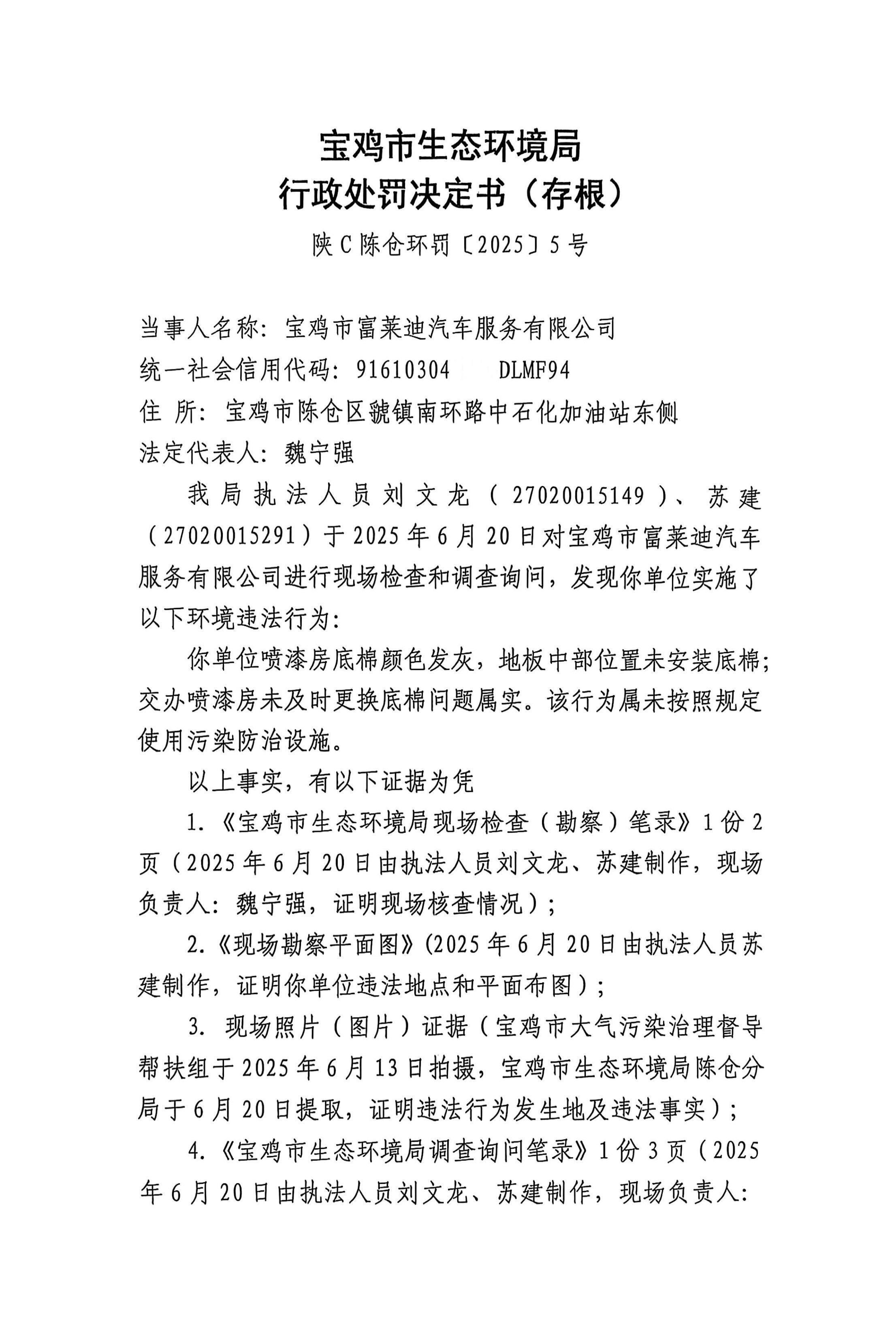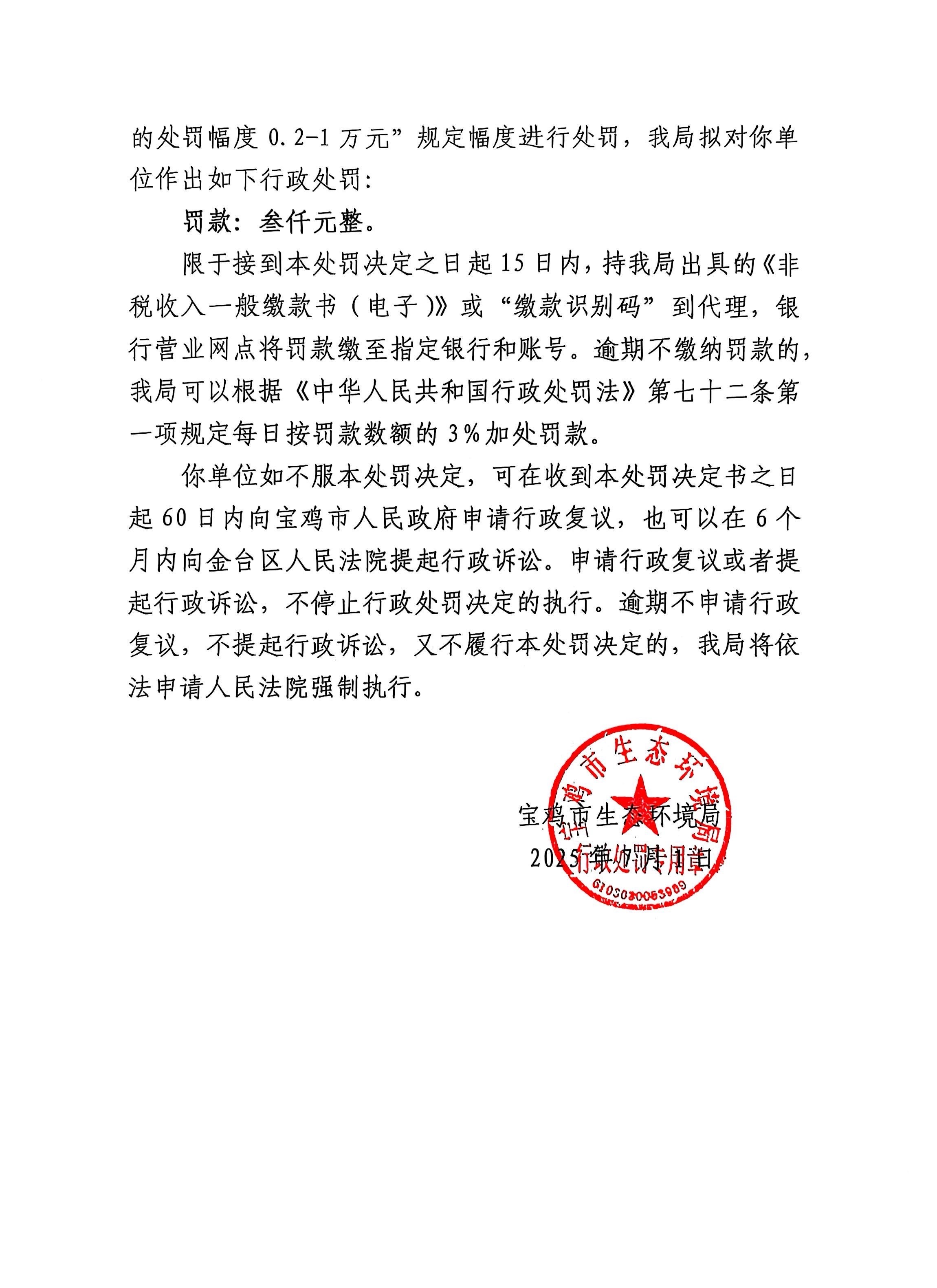 宝鸡市生态环境局行政处罚决定书(存根)陕C陈仓环罚〔 2025 〕5号