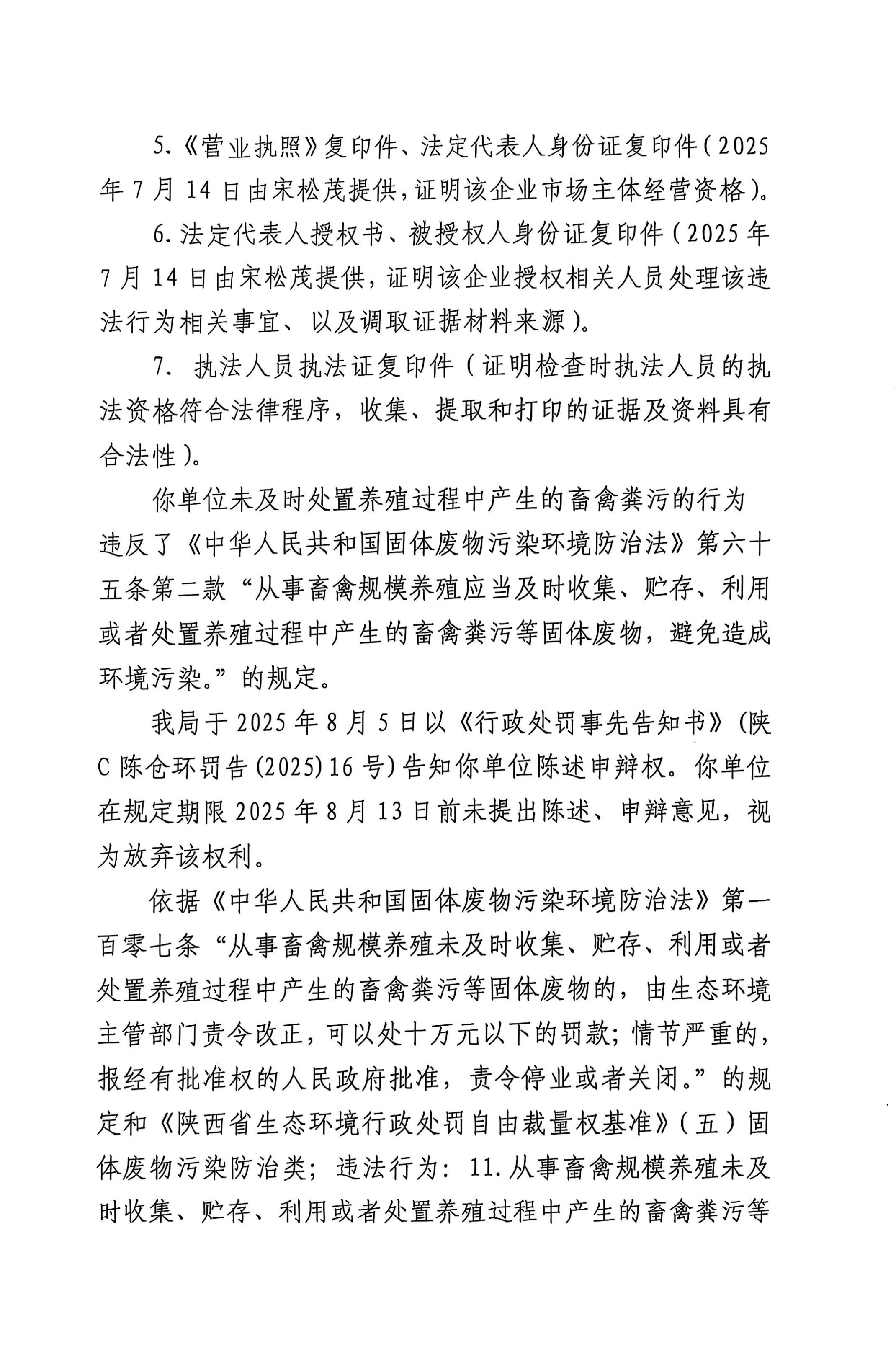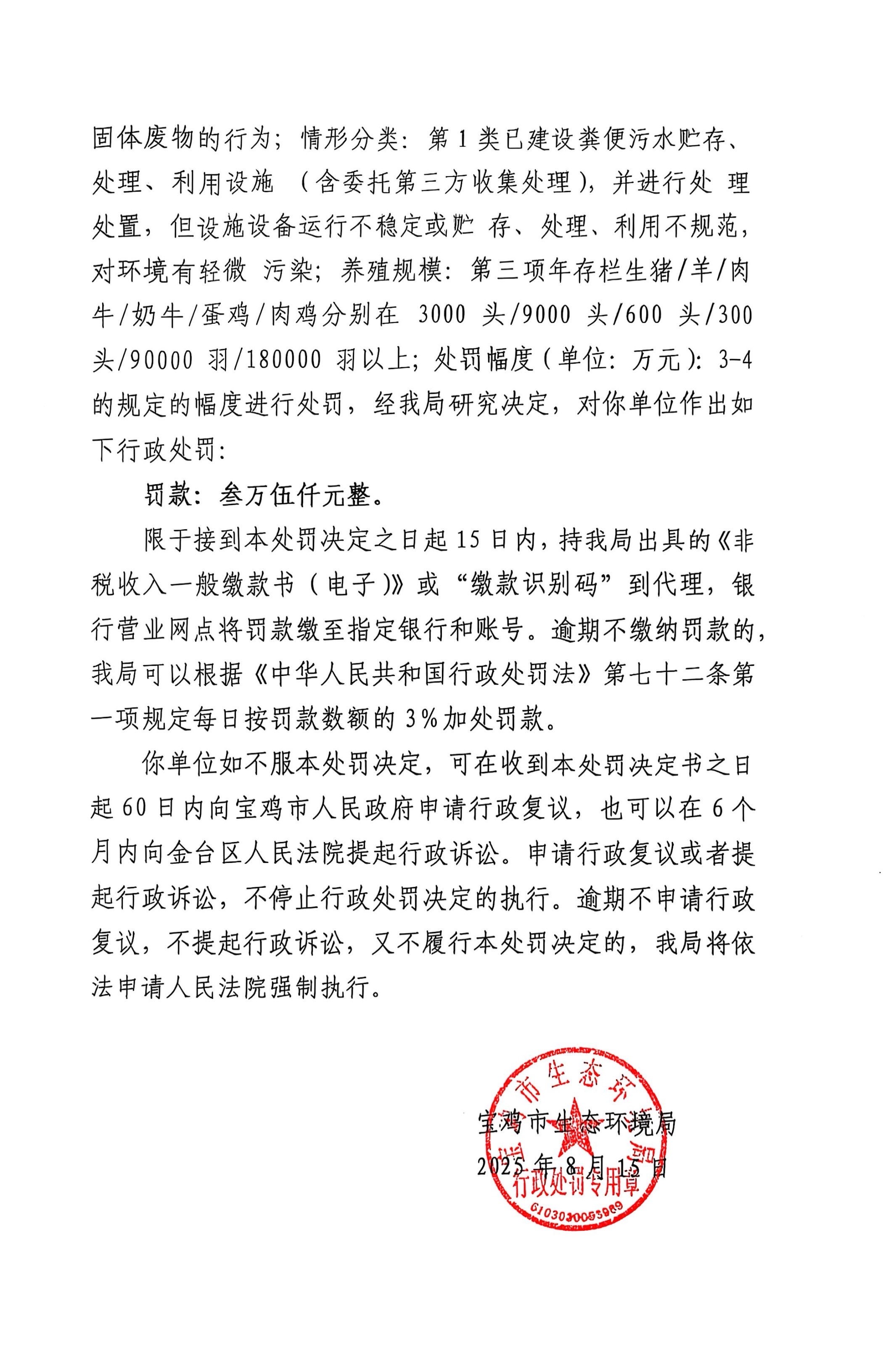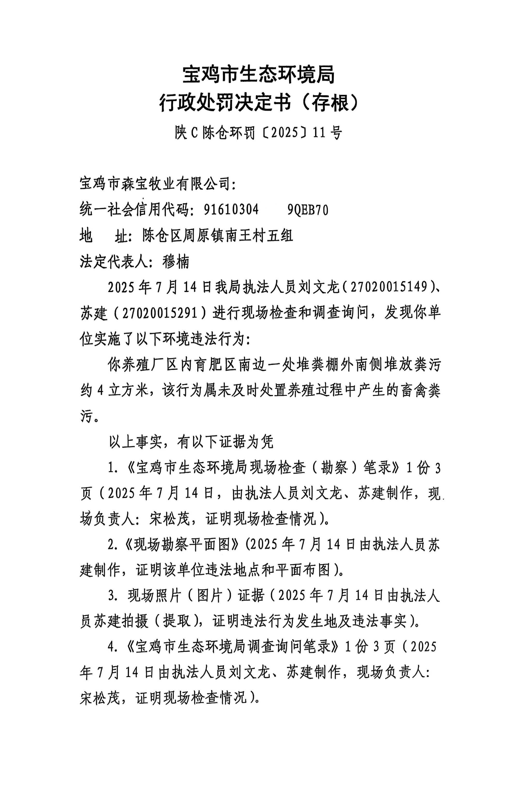 宝鸡市生态环境局行政处罚决定书(存根)陕C陈仓环罚〔 2025 〕11号