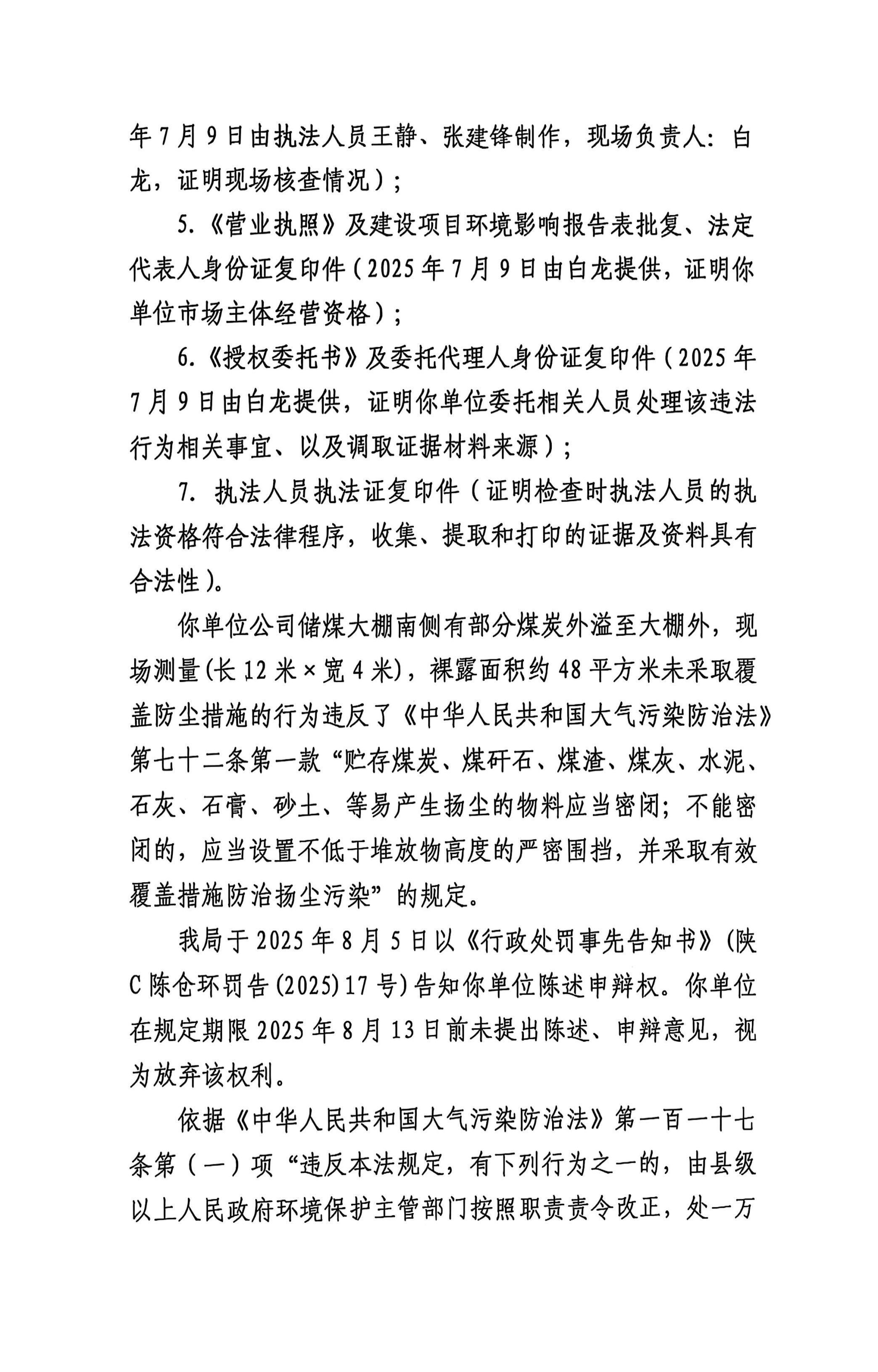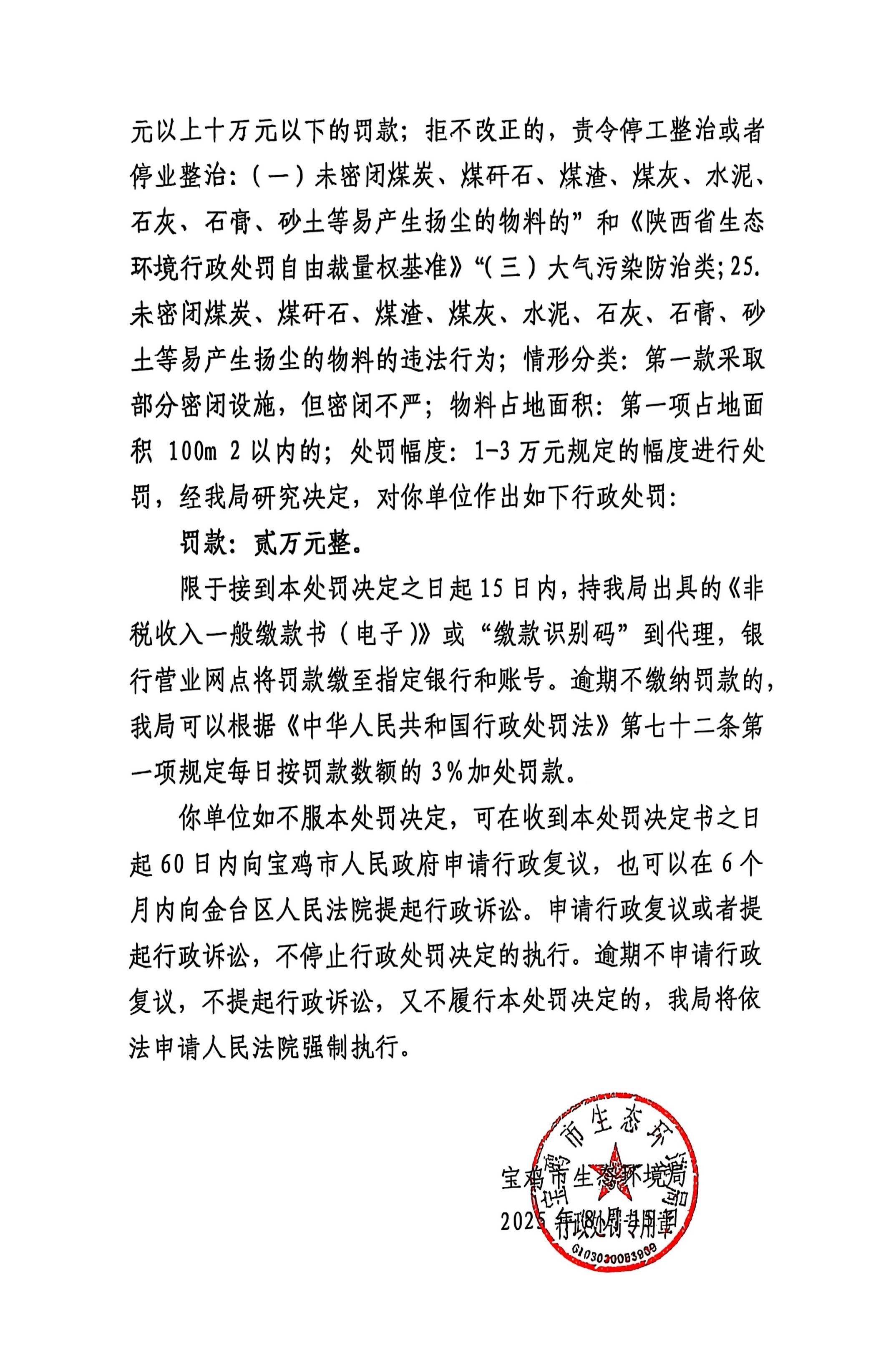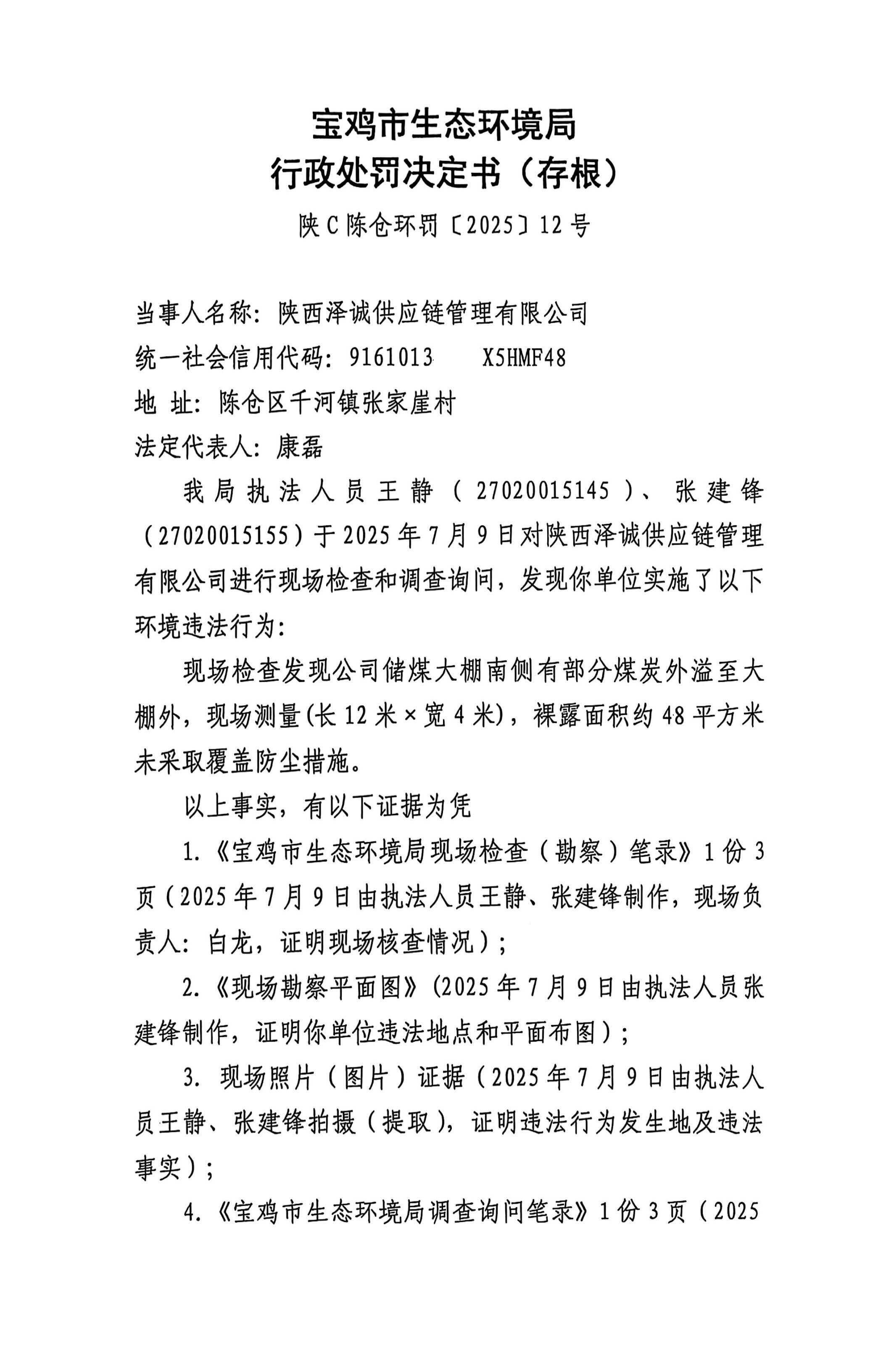 宝鸡市生态环境局行政处罚决定书(存根)陕C陈仓环罚〔 2025 〕12号