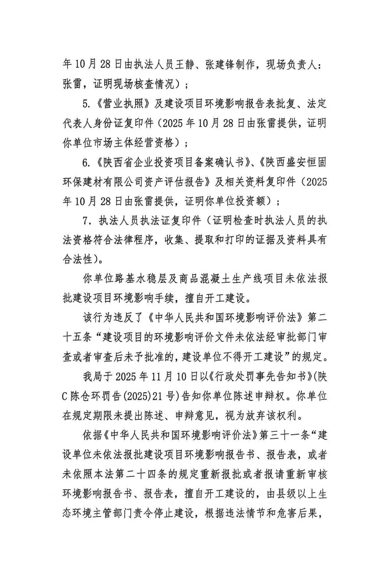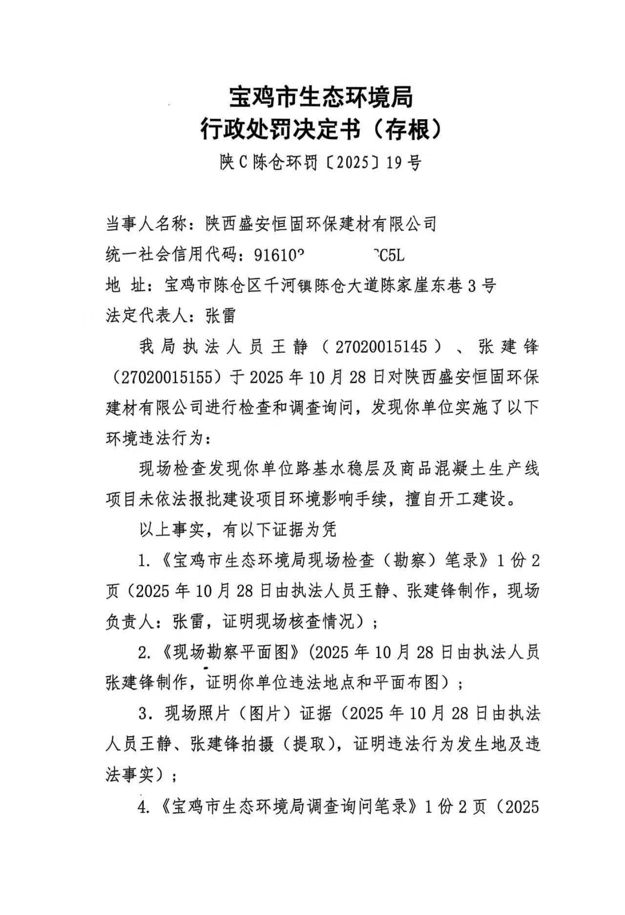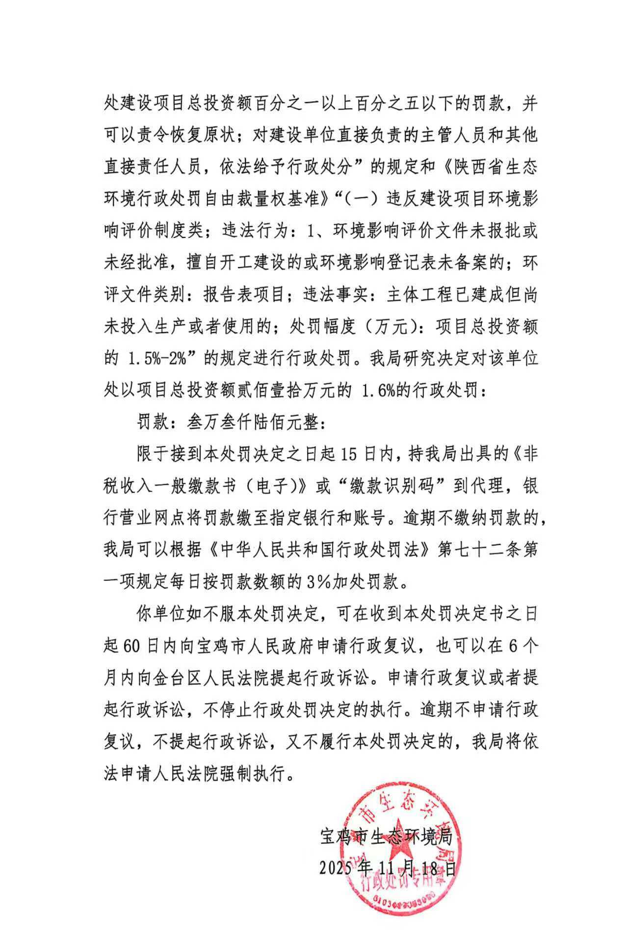 宝鸡市生态环境局行政处罚决定书(存根)陕C陈仓环罚〔2025〕19号