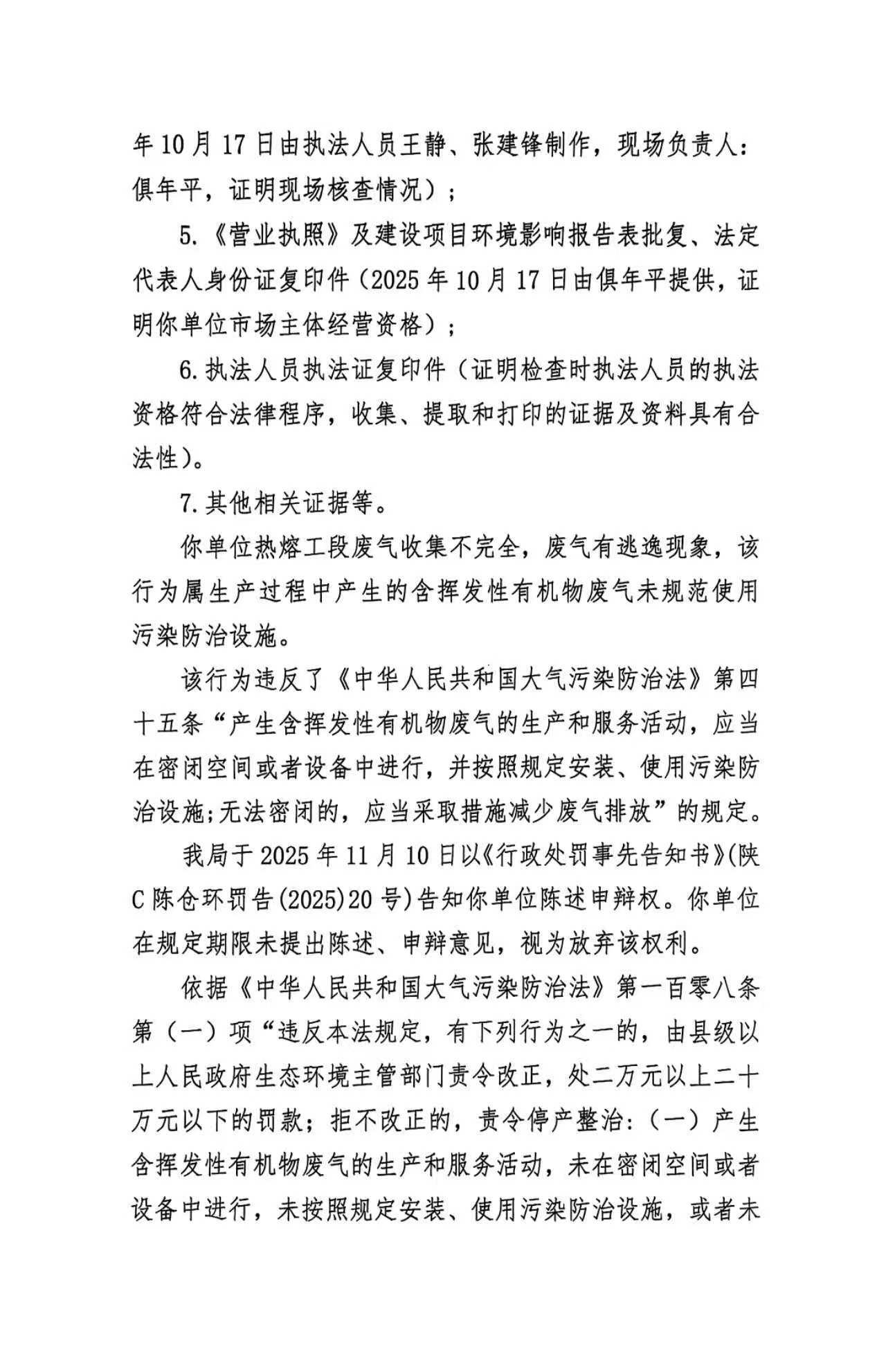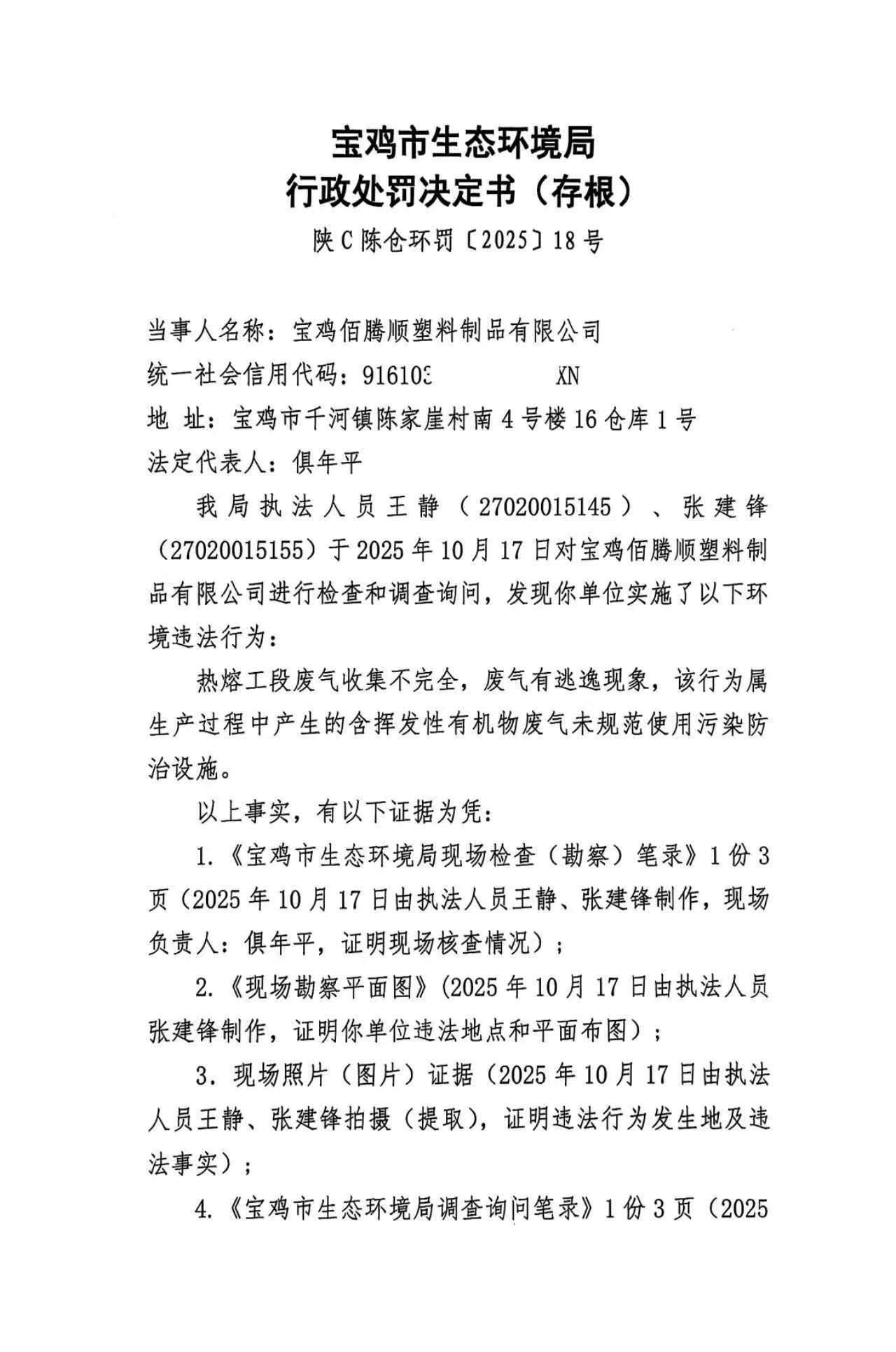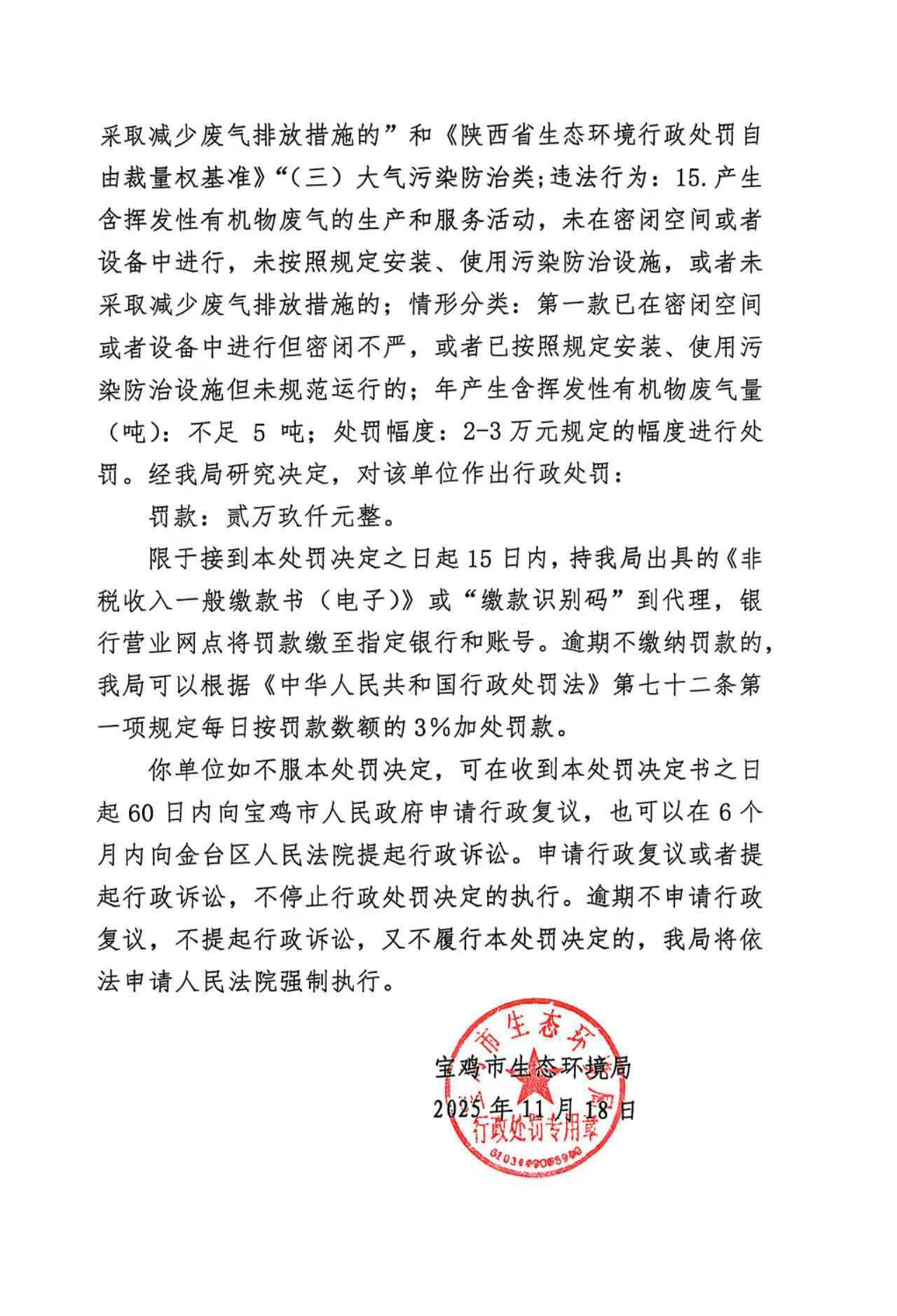 宝鸡市生态环境局行政处罚决定书(存根)陕C陈仓环罚〔2025〕18号
