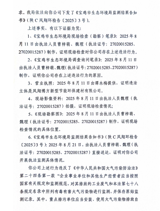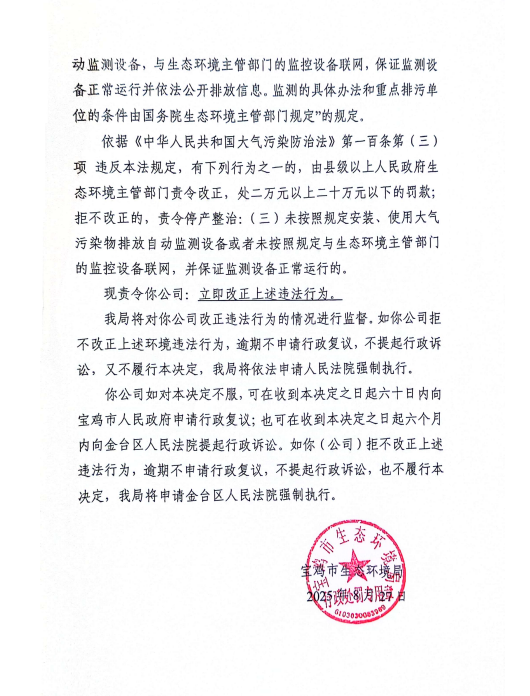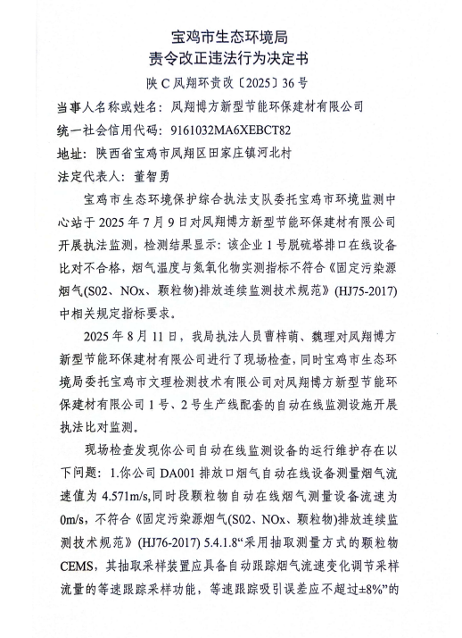 宝鸡市生态环境局责令改正违法行为决定书陕C凤翔环责改〔2025〕36号