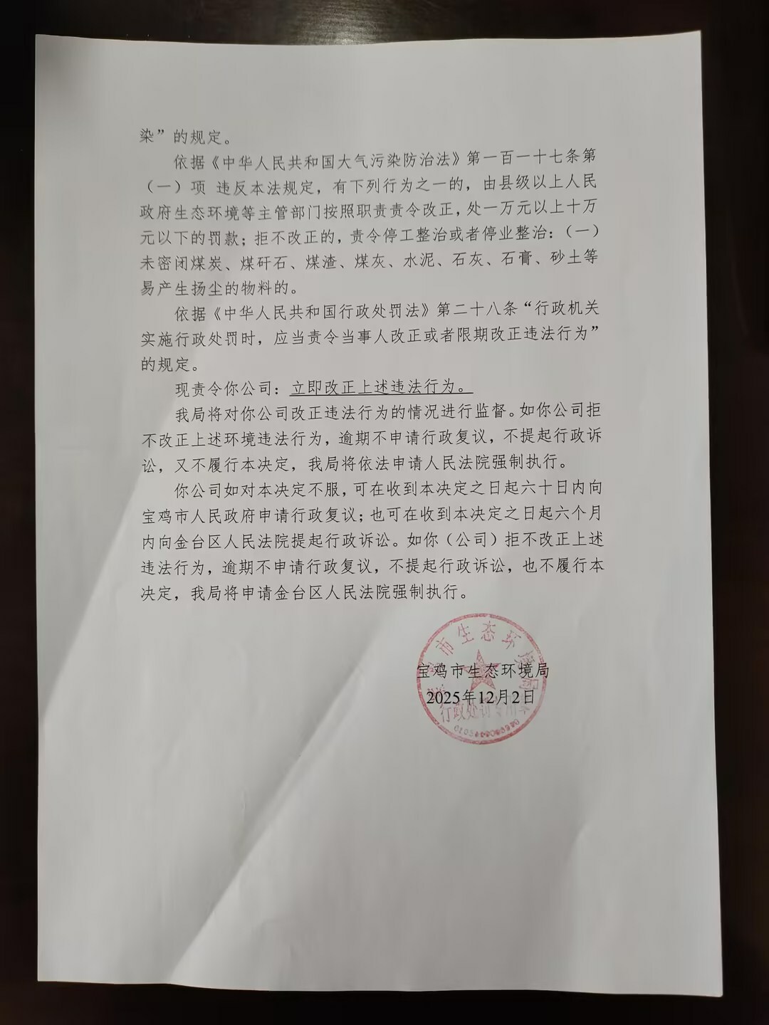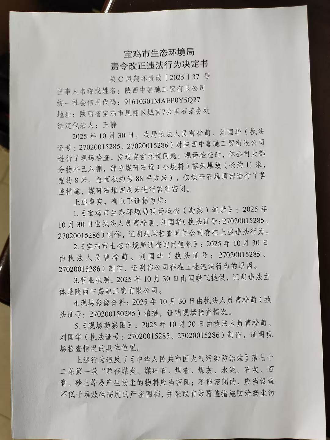 宝鸡市生态环境局责令改正违法行为决定书 陕C凤翔环责改〔2025〕37 号