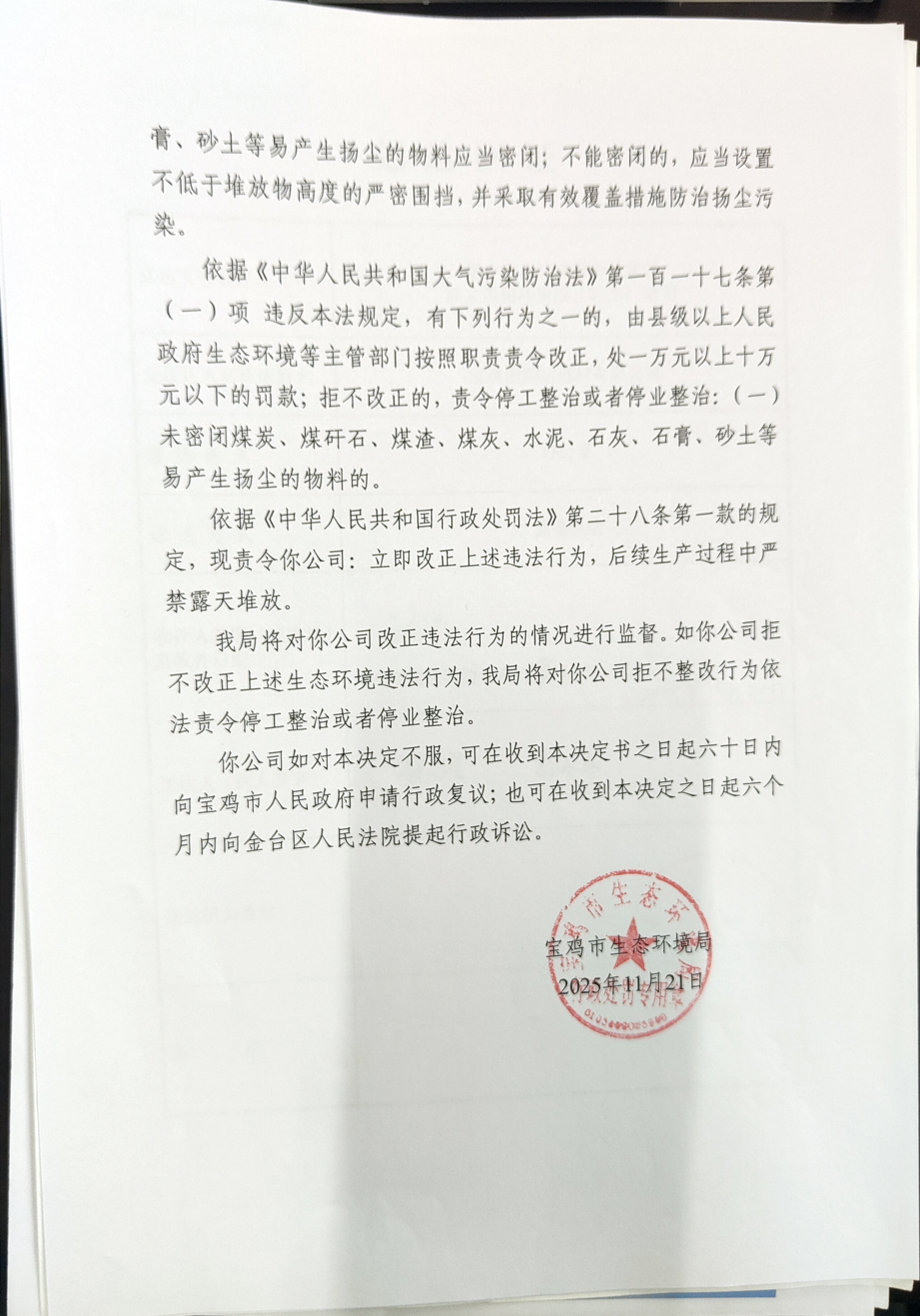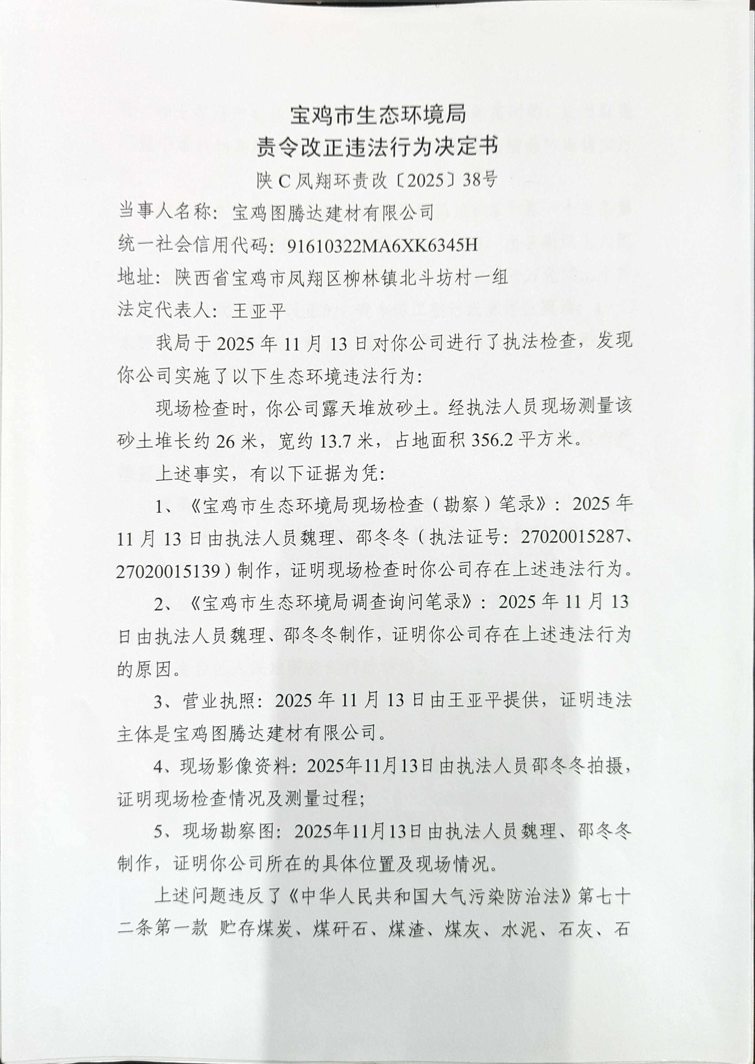 宝鸡市生态环境局责令改正违法行为决定书陕C凤翔环责改〔2025〕38号