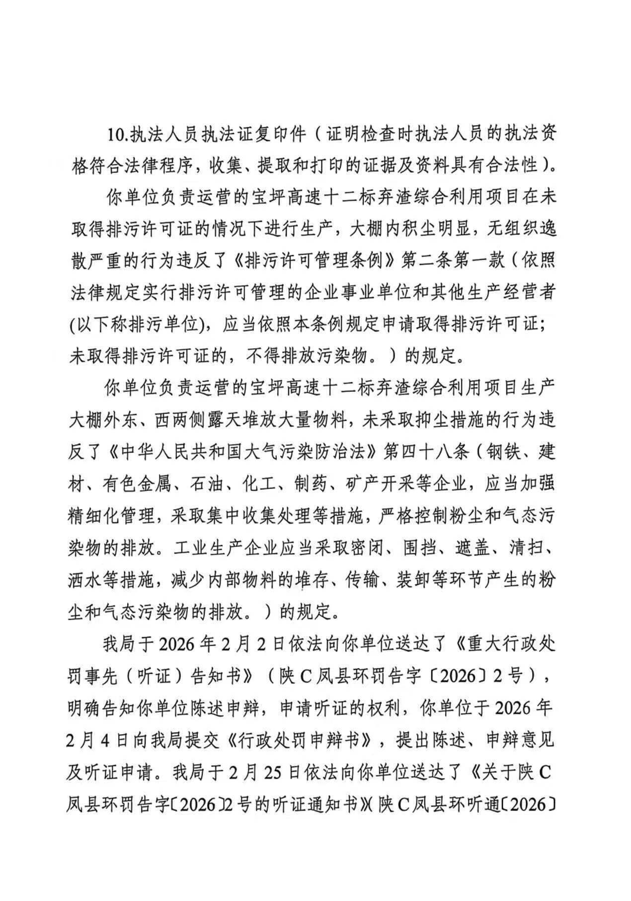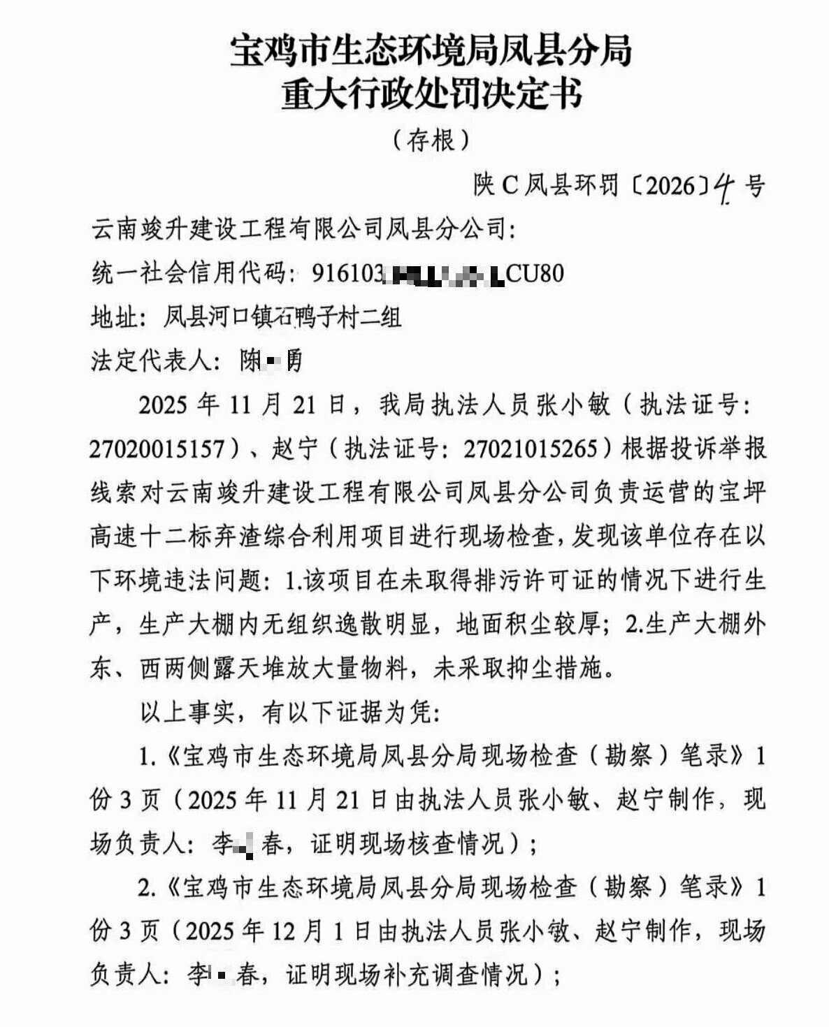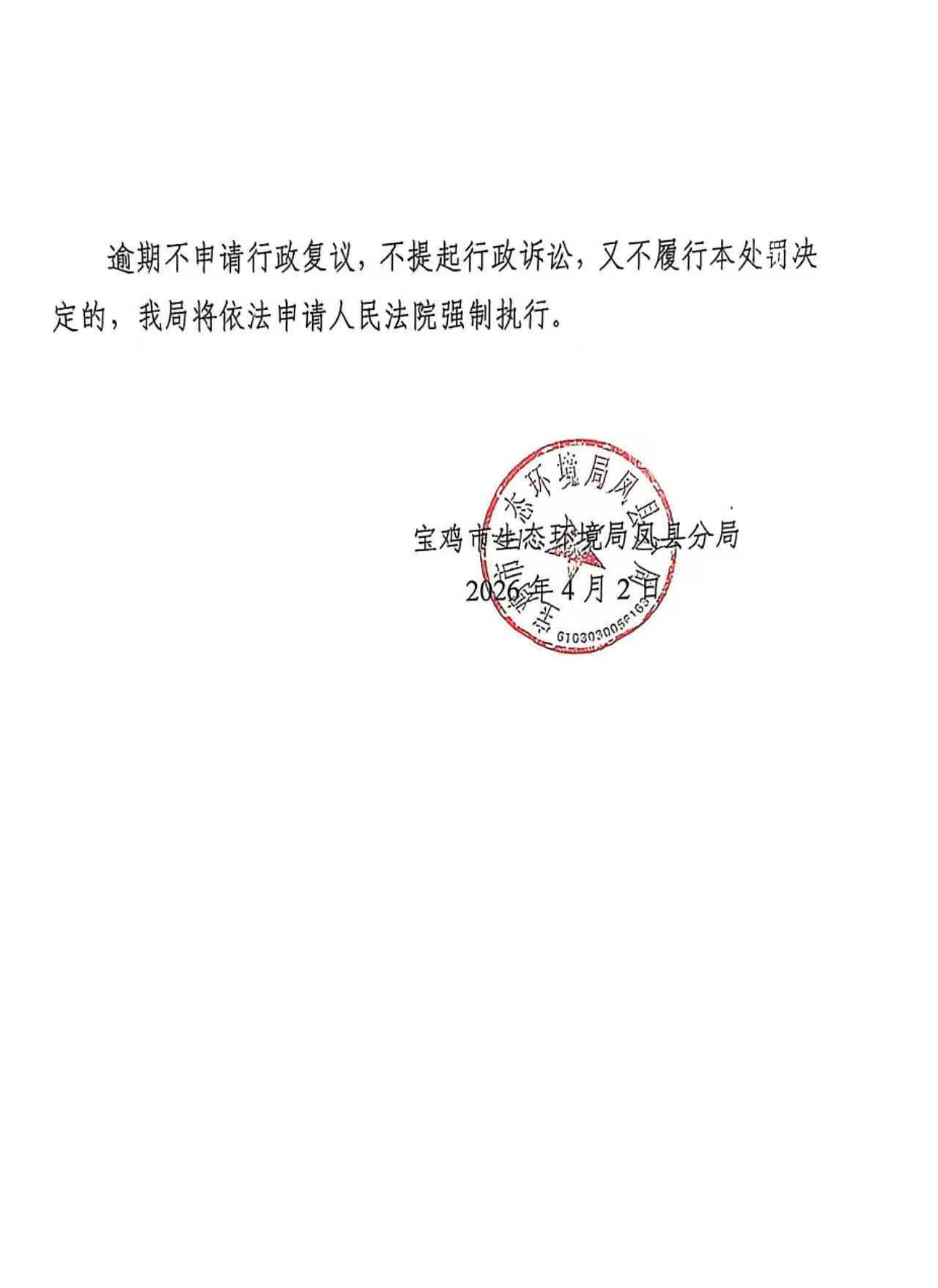 宝鸡市生态环境局凤县分局重大行政处罚决定书 陕C凤县环罚〔2026〕4号