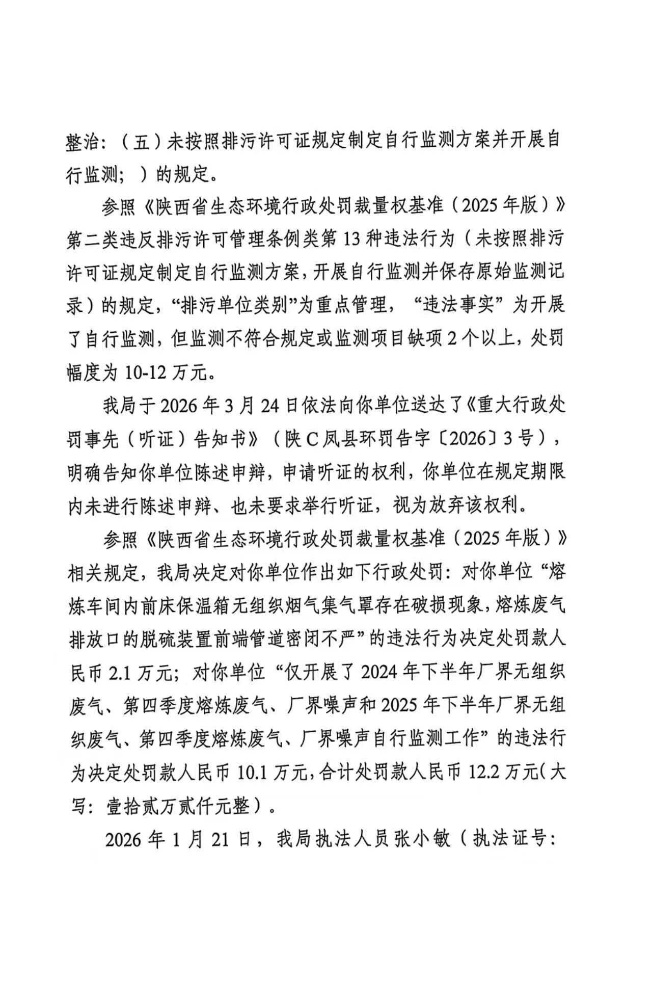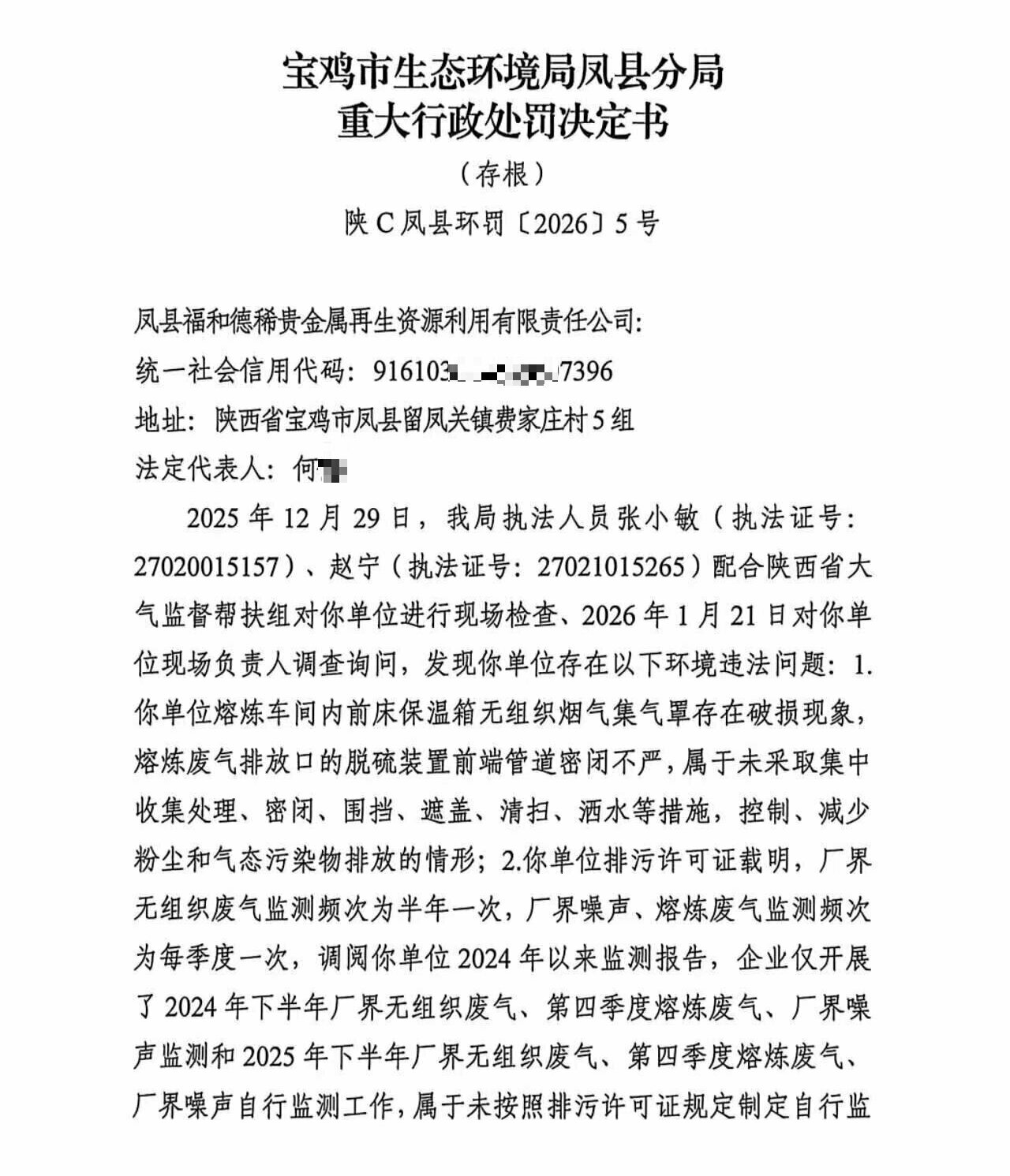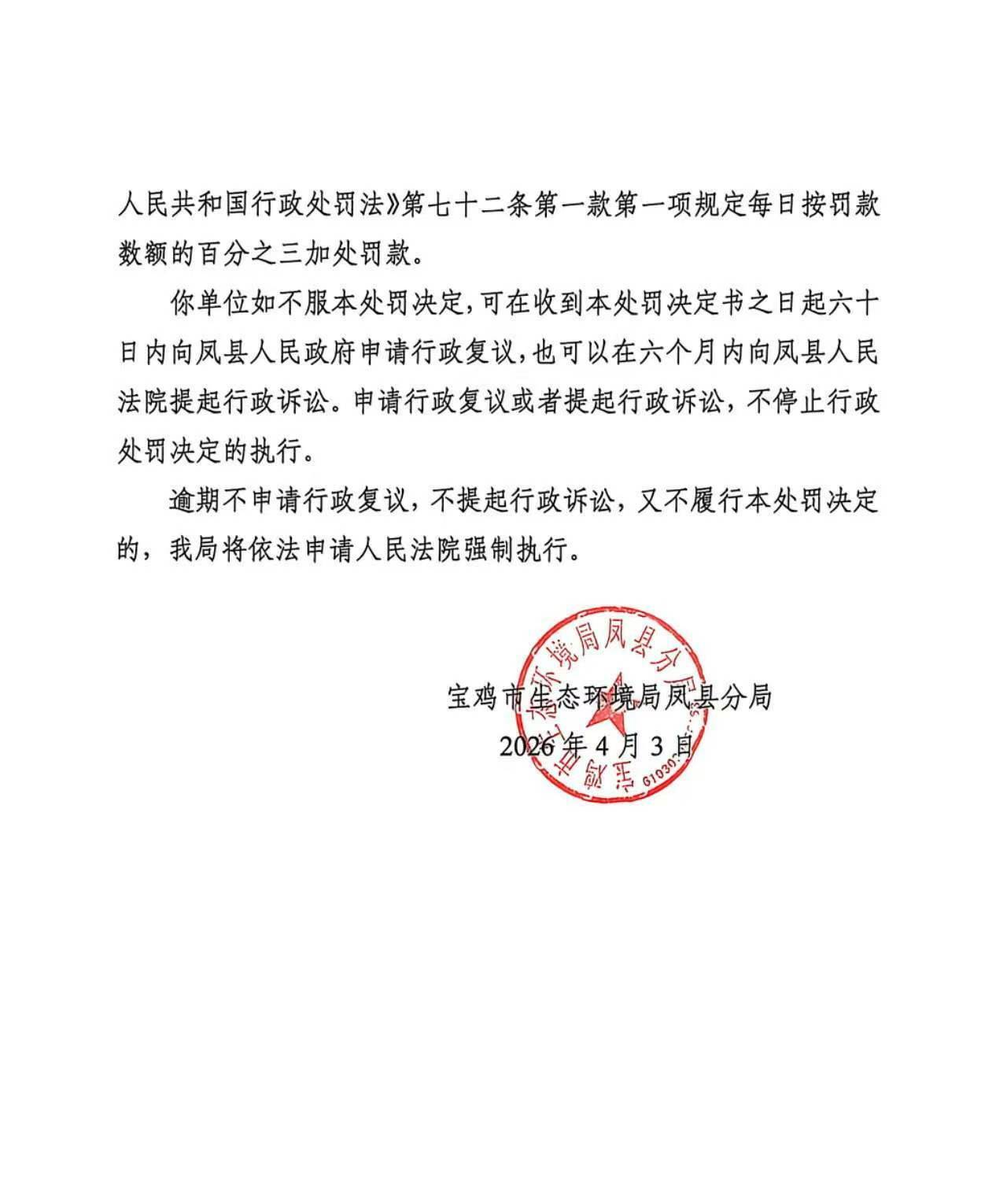 宝鸡市生态环境局凤县分局重大行政处罚决定书陕C凤县环罚〔2026〕5号