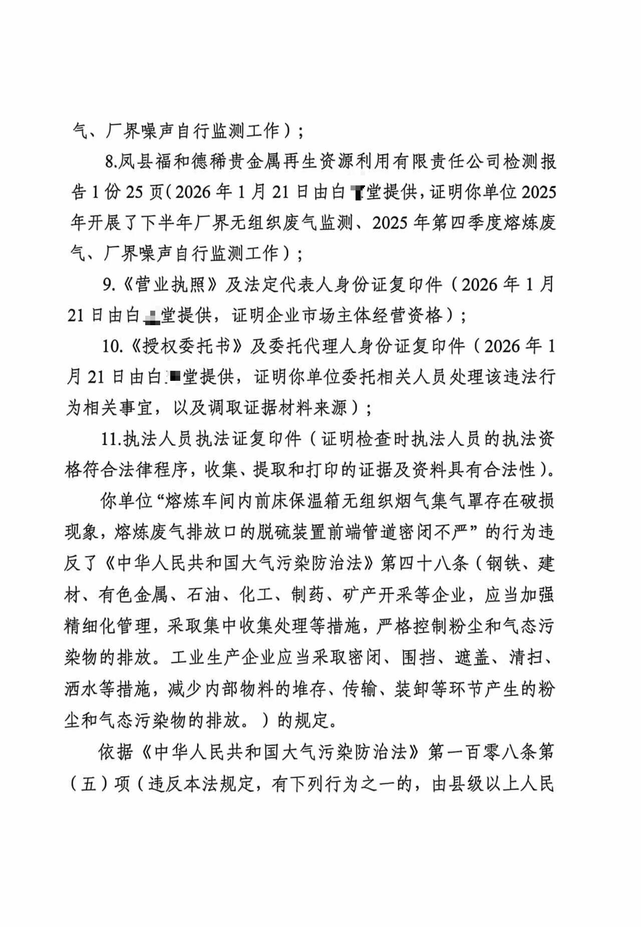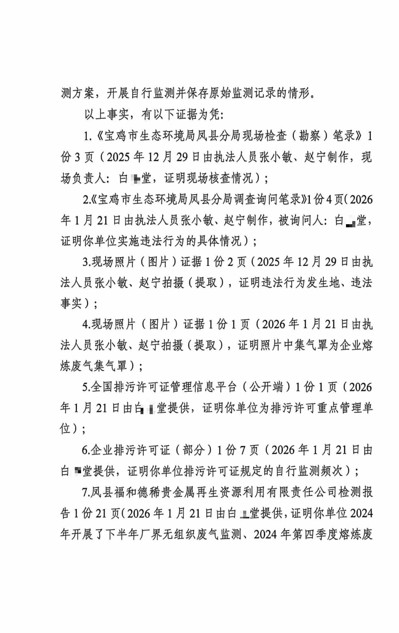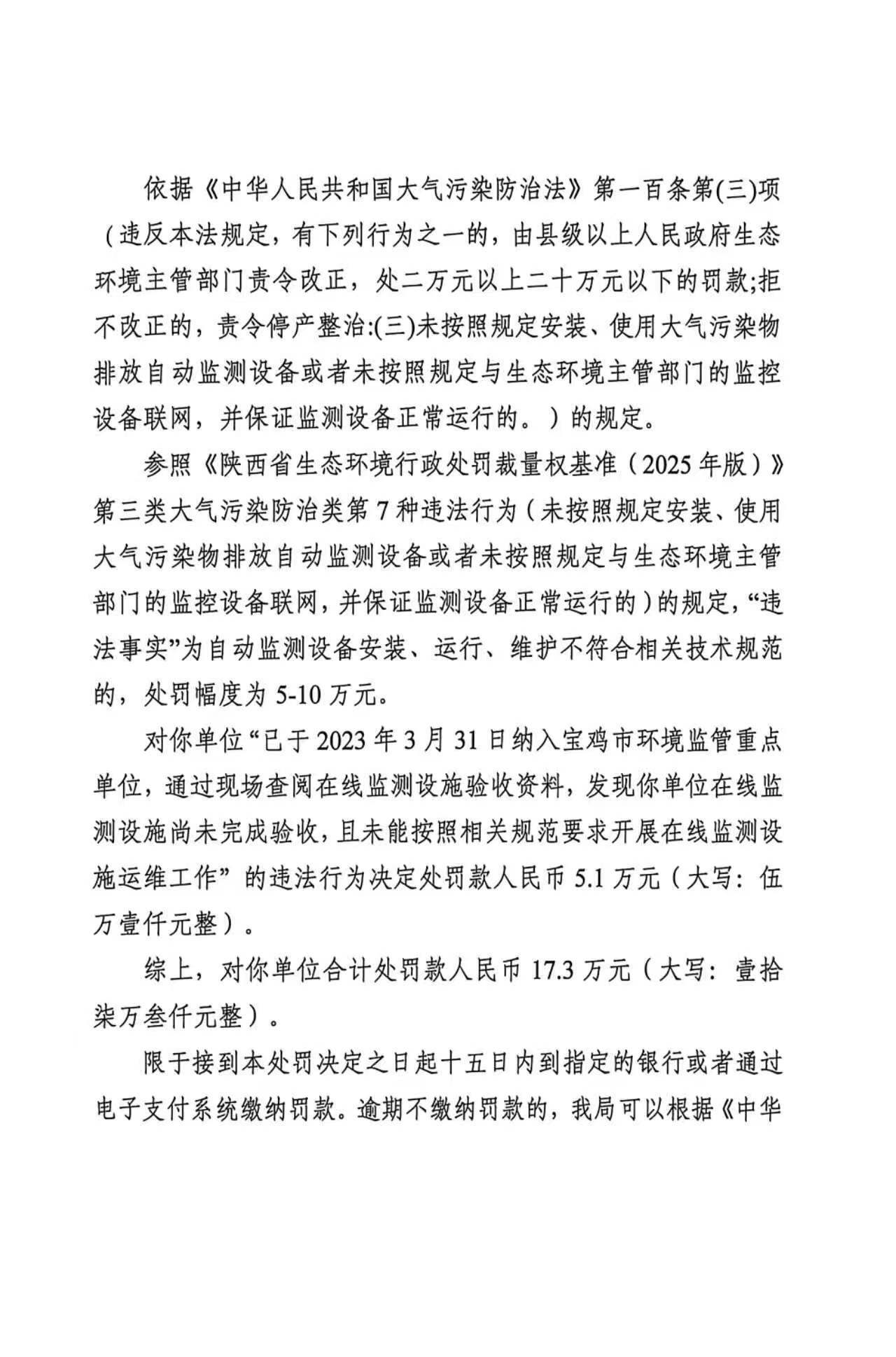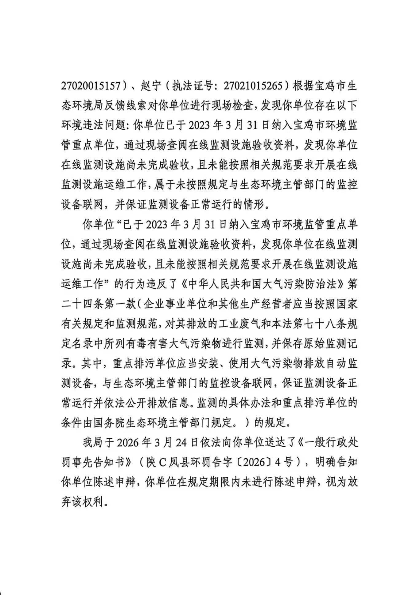 宝鸡市生态环境局凤县分局重大行政处罚决定书陕C凤县环罚〔2026〕5号