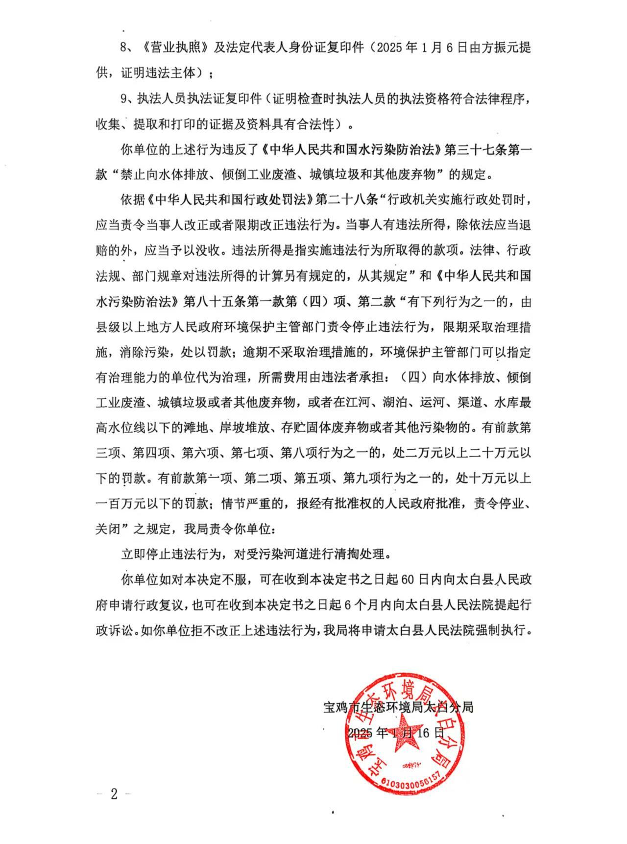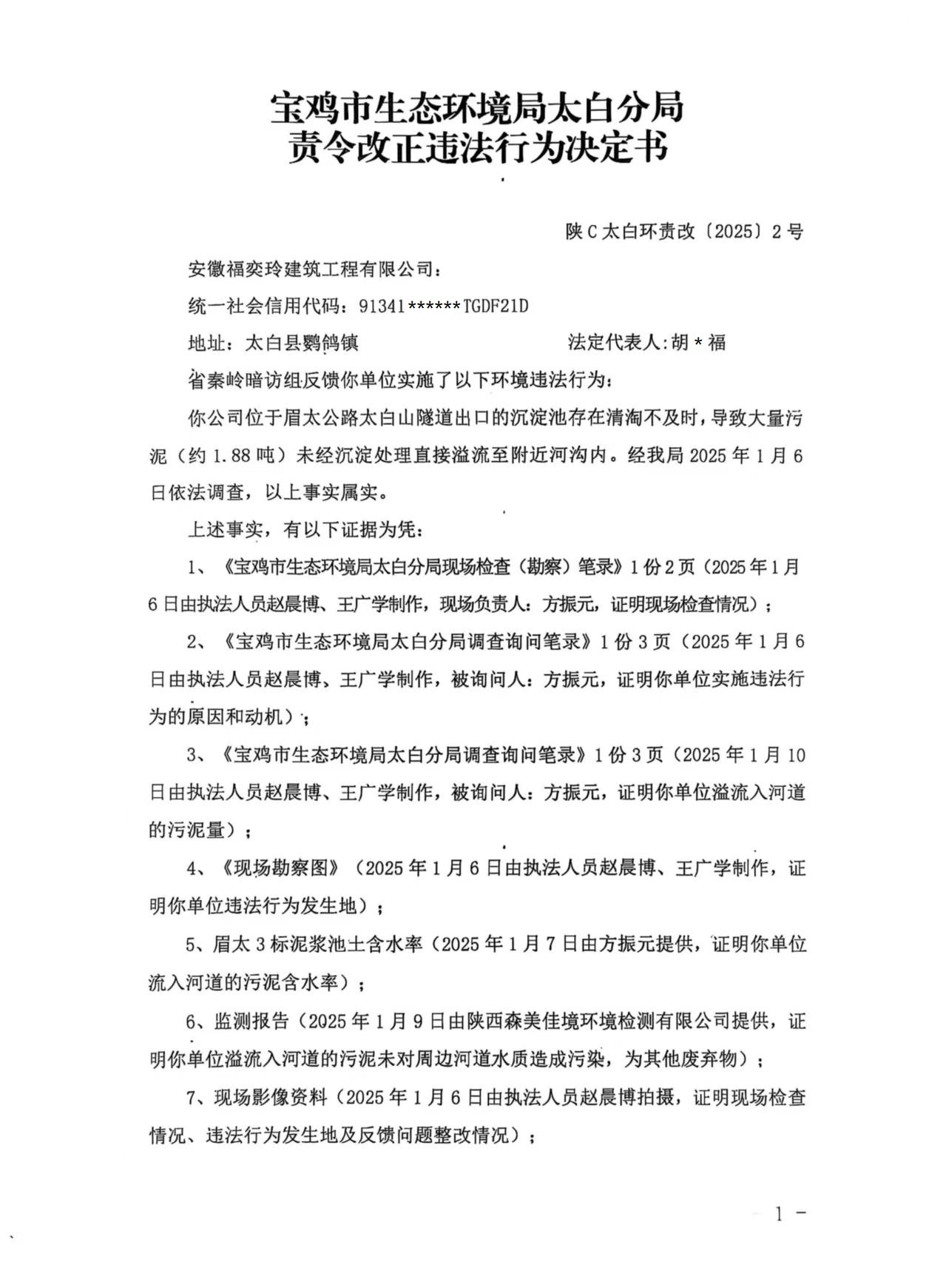 宝鸡市生态环境局太白分局责令改正违法行为决定书陕C太白环责改〔2025〕2号