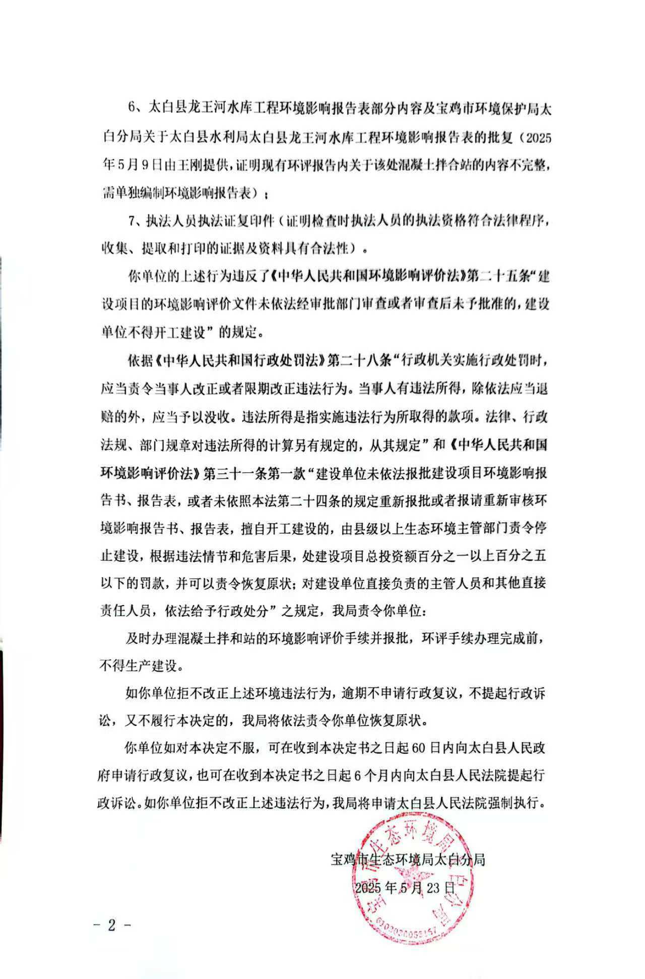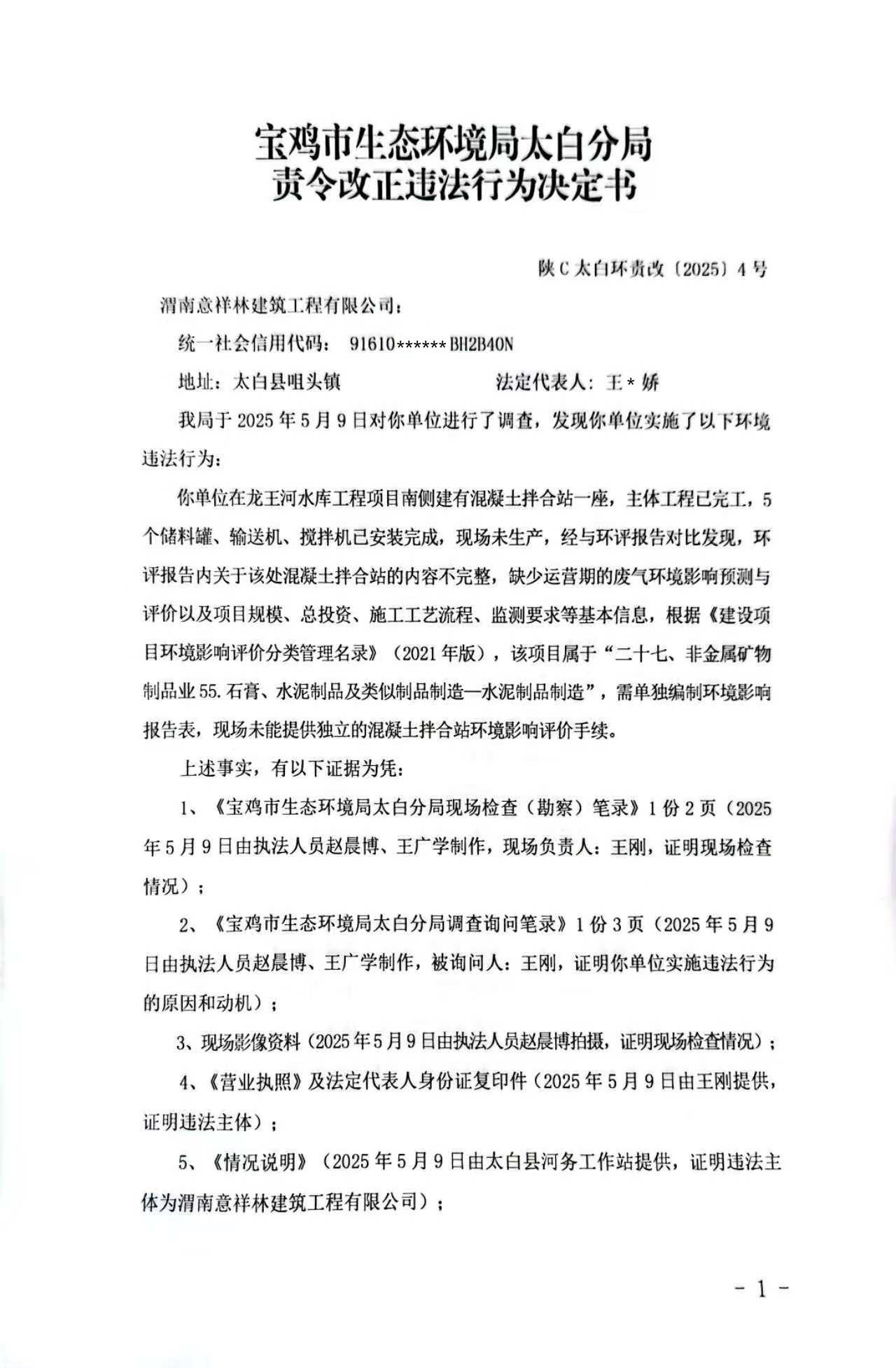 宝鸡市生态环境局太白分局责令改正违法行为决定书陕C太白环责改〔2025〕4号