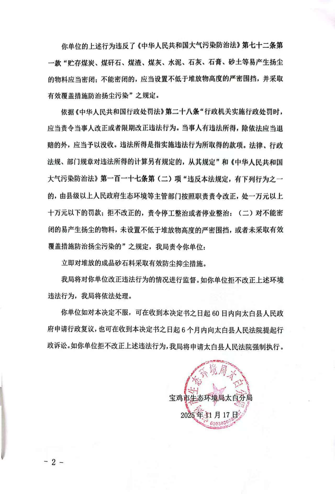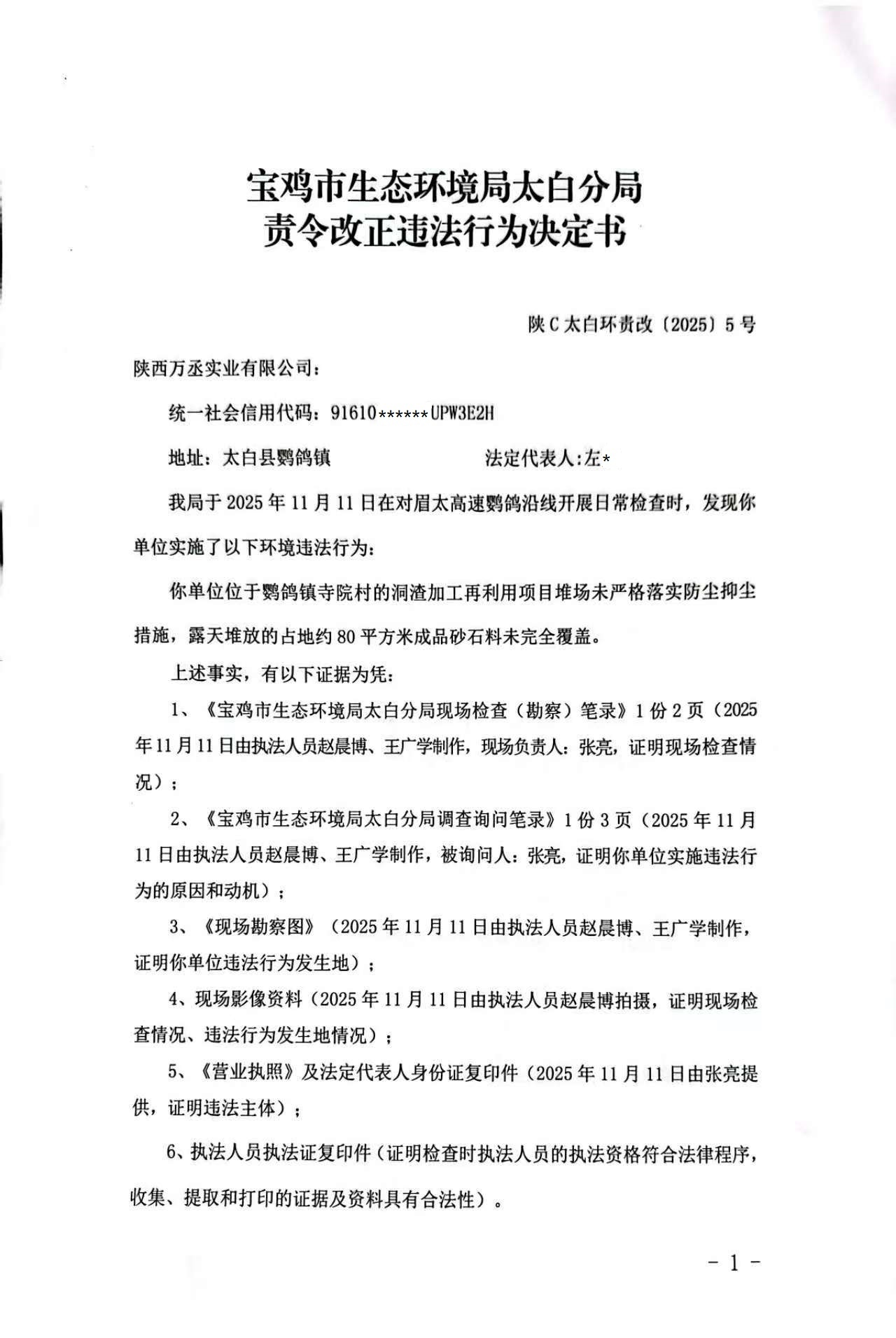 宝鸡市生态环境局太白分局责令改正违法行为决定书陕C太白环责改〔2025〕5号