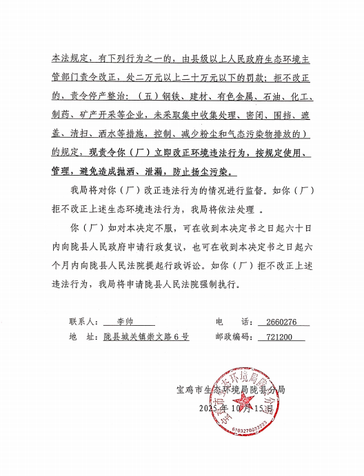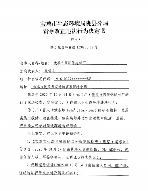 宝鸡市生态环境局陇县分局责令改正违法行为决定书 陕C陇县环责改〔2025〕12号