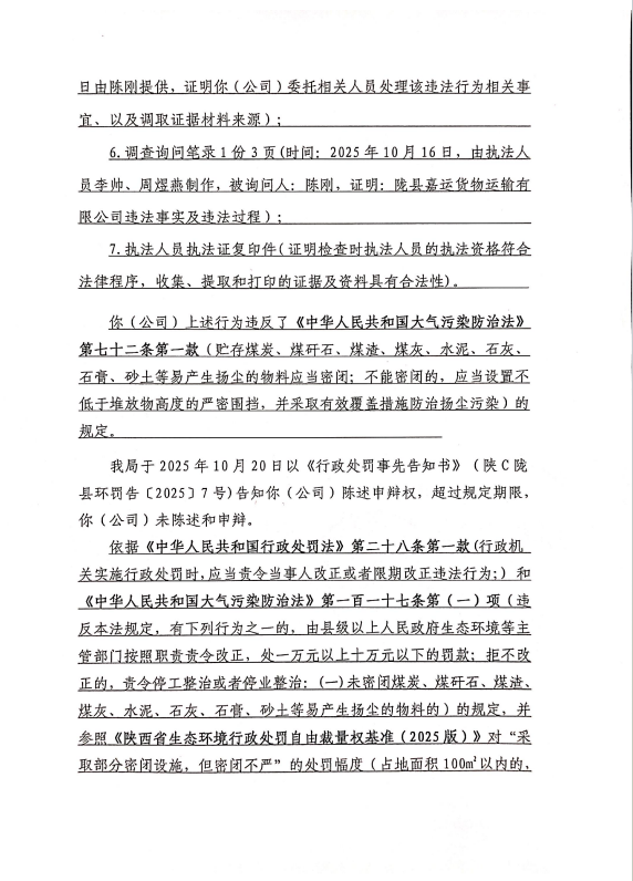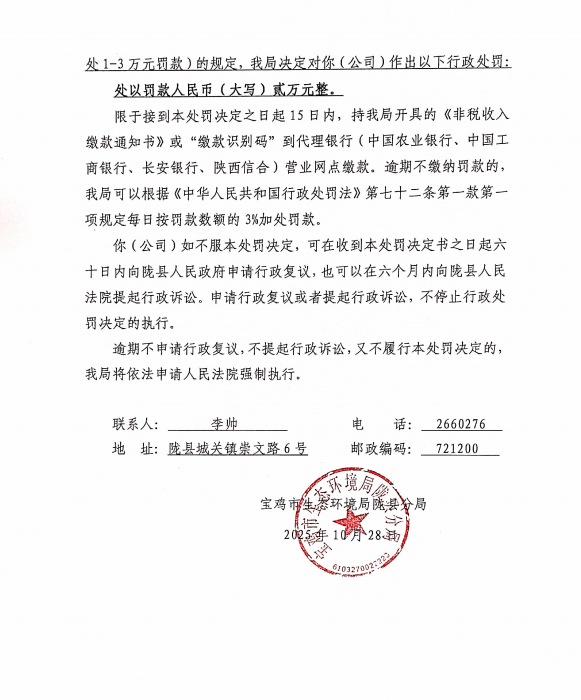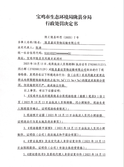 宝鸡市生态环境局陇县分局行政处罚决定书 陕C陇县环罚〔2025〕7号