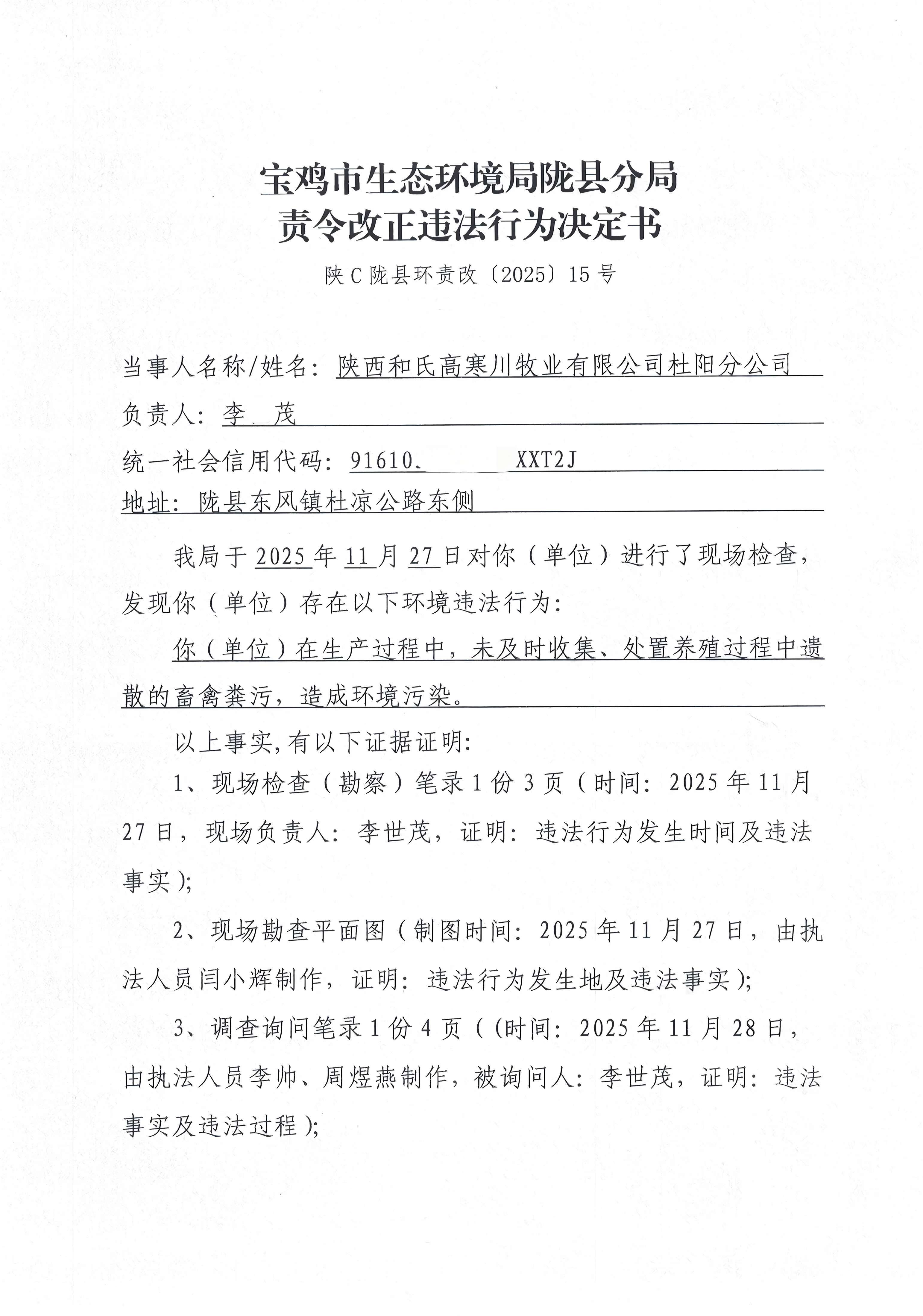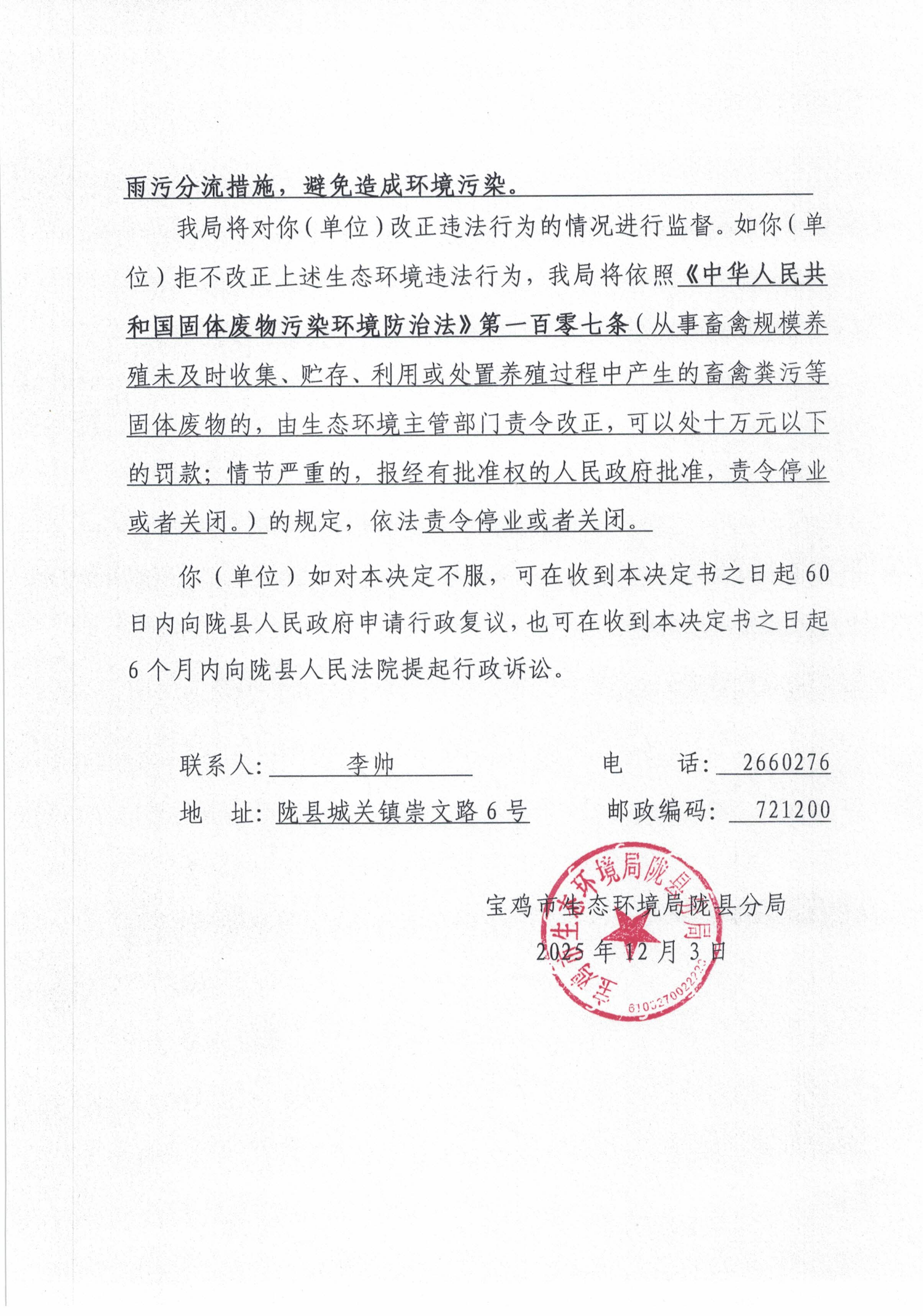 宝鸡市生态环境局陇县分局责令改正违法行为决定书(陕C陇县环责改【2025】15号)