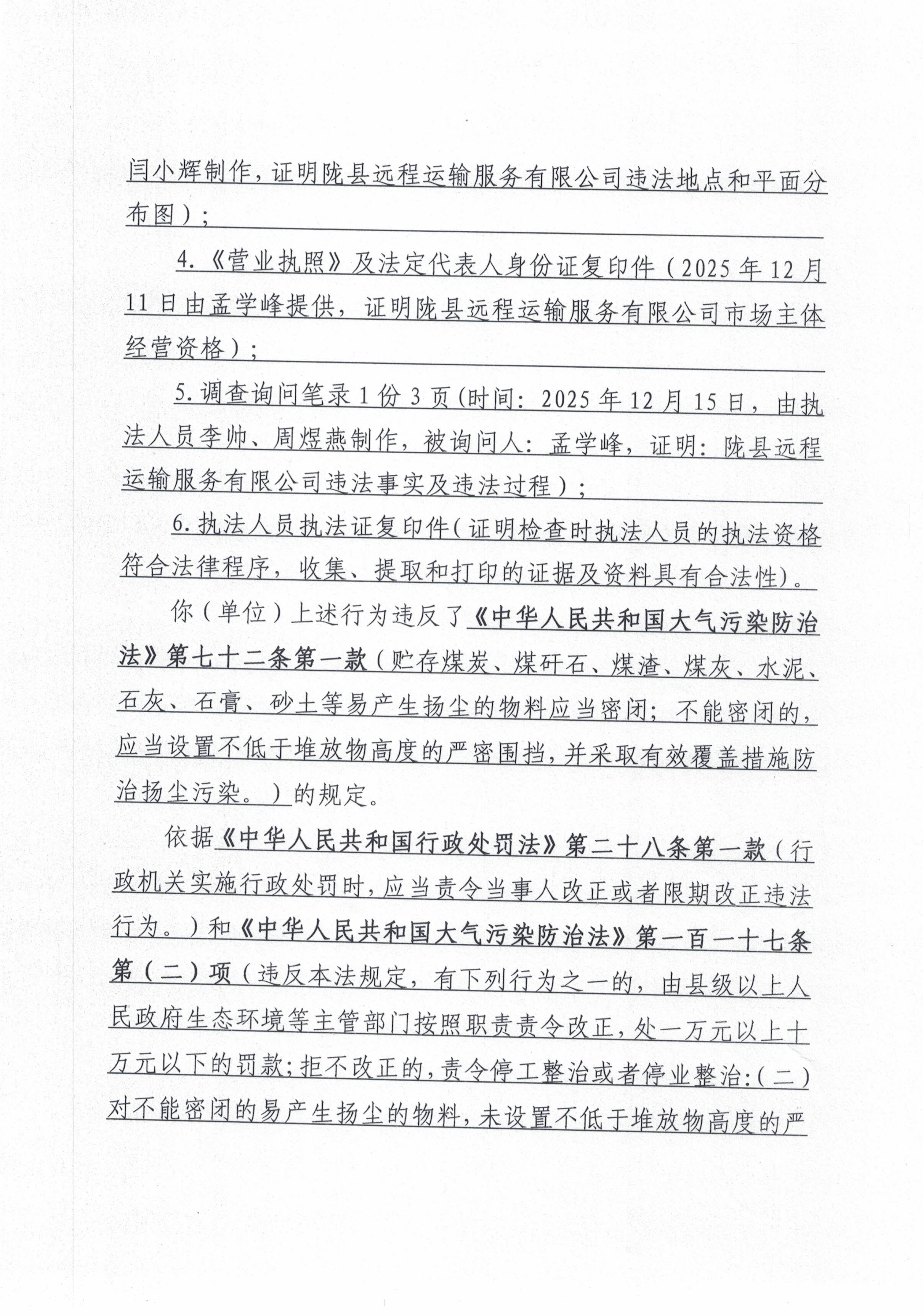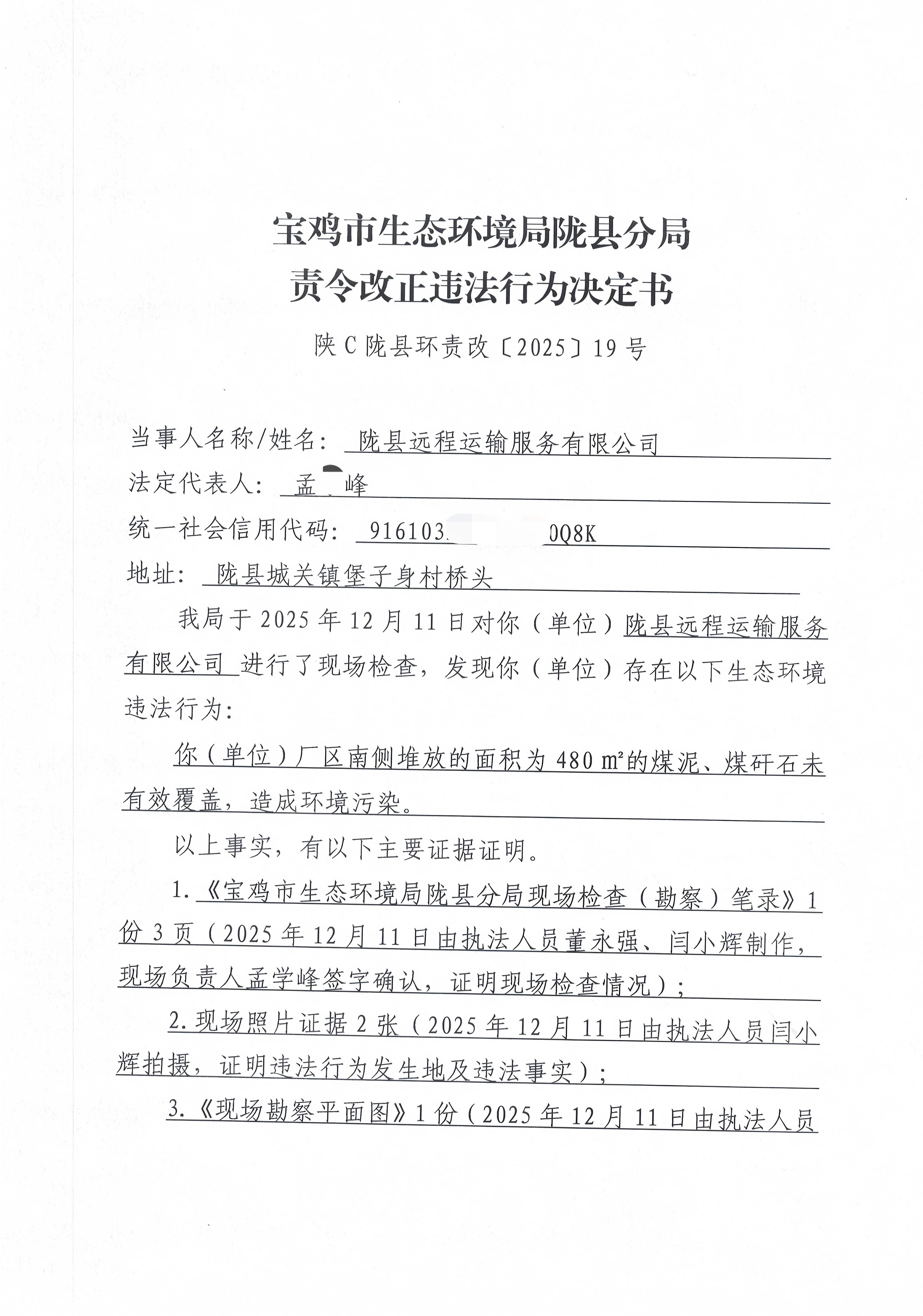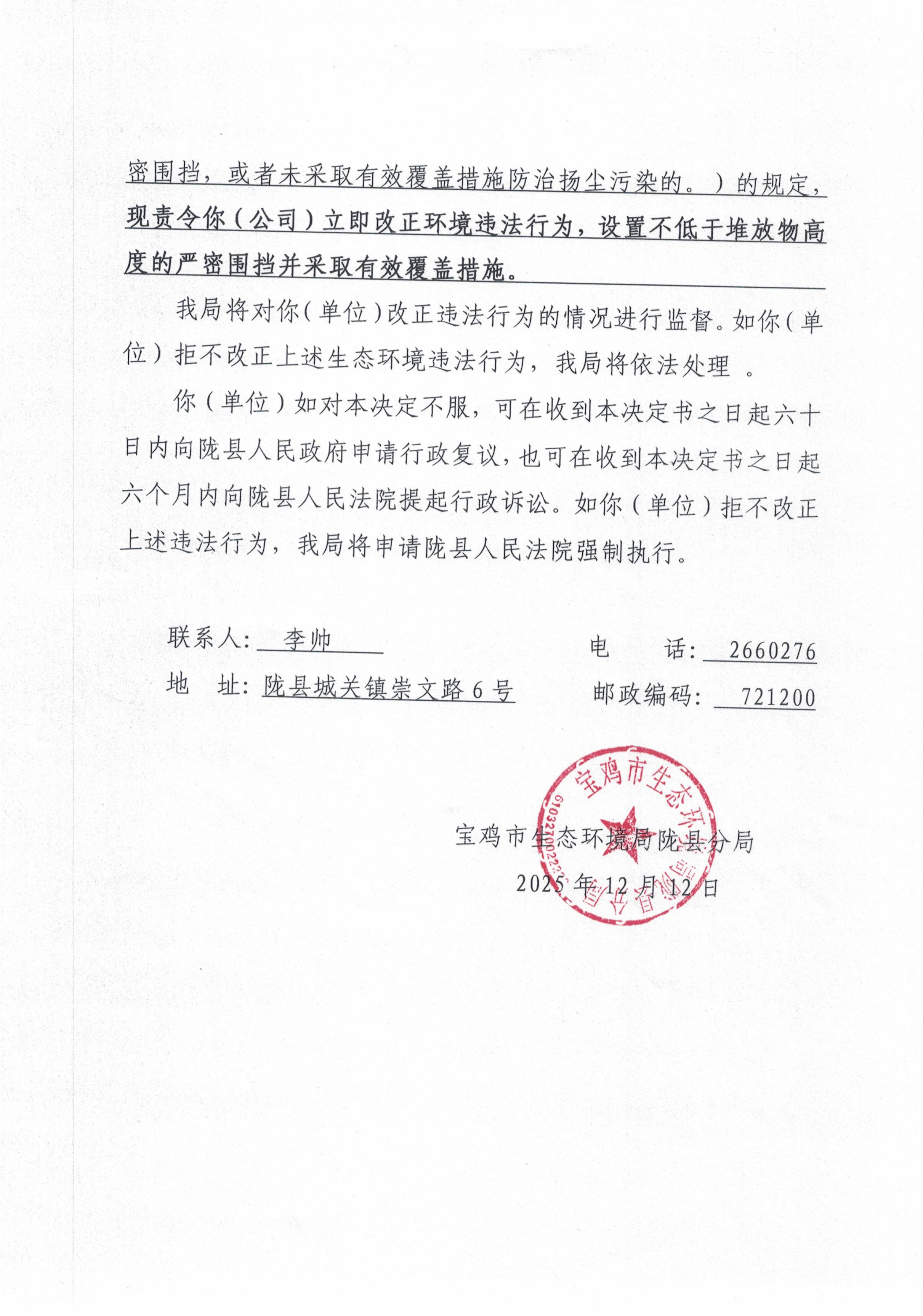 宝鸡市生态环境局陇县分局责令改正违法行为决定书(陕C陇县环责改【2025】19号)