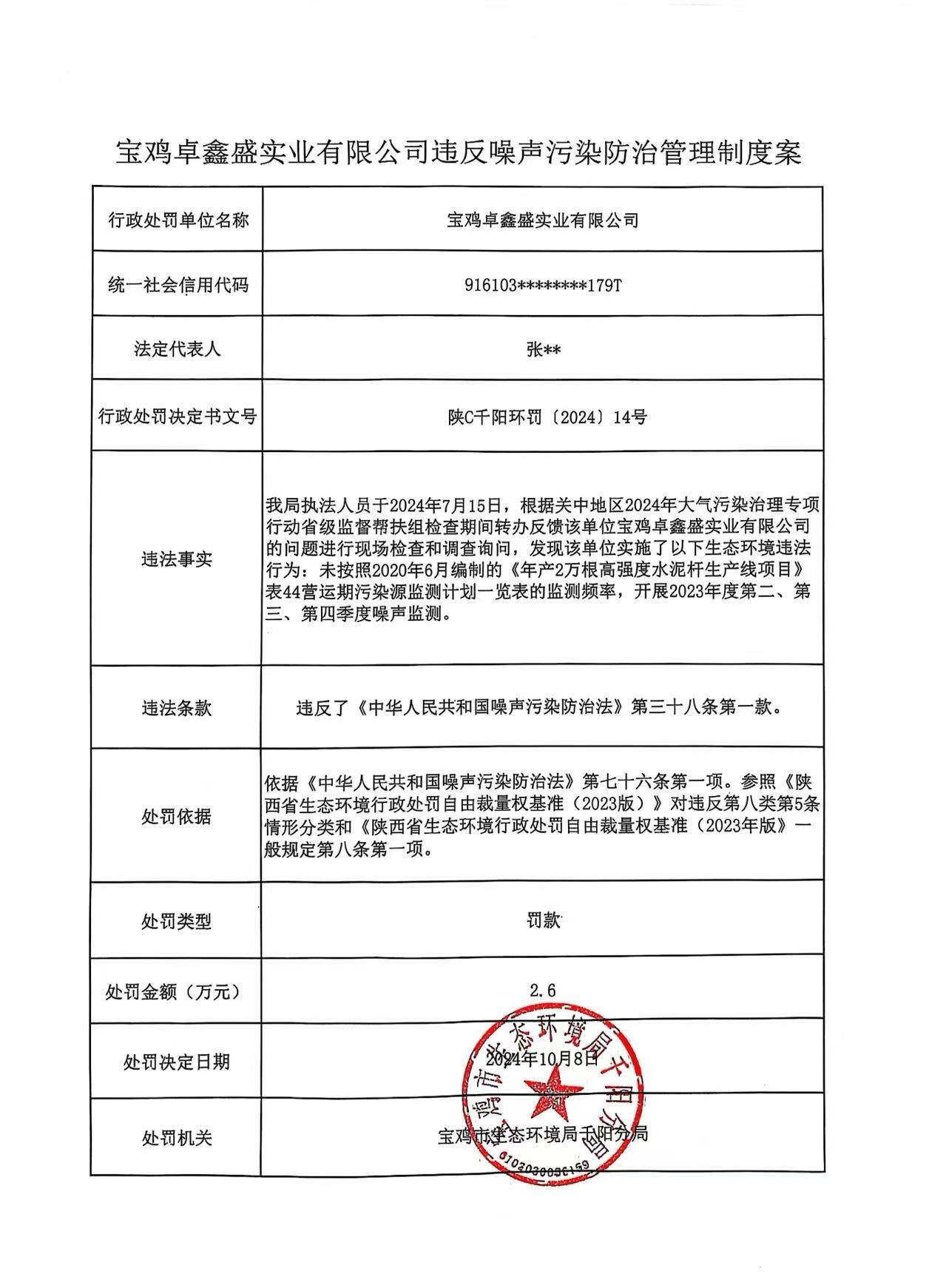 宝鸡卓鑫盛实业有限公司违反噪声污染防治管理制度