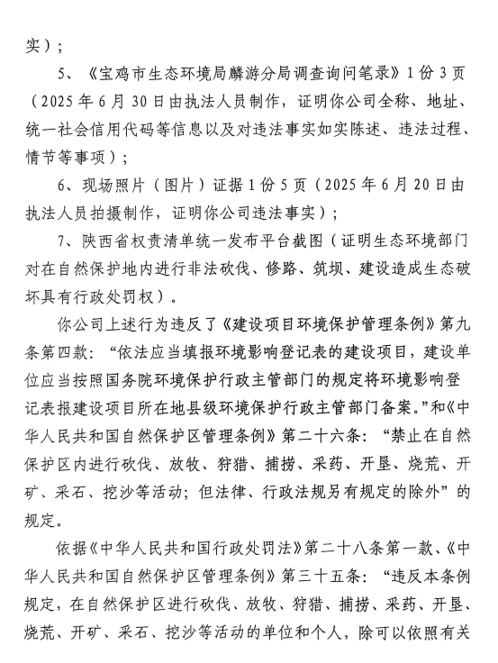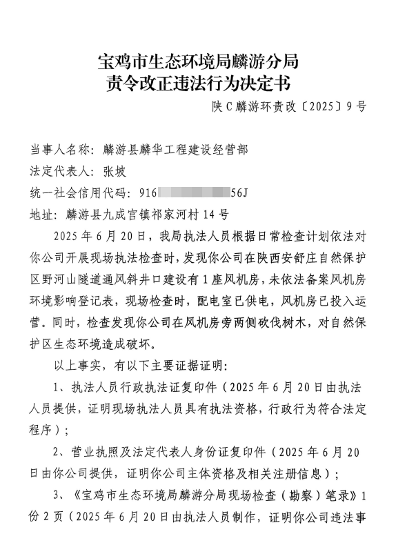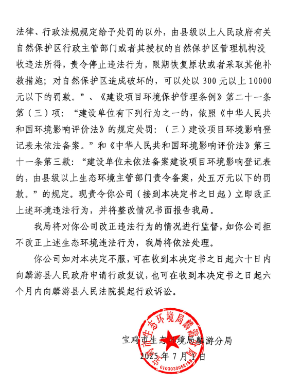 宝鸡市生态环境局麟游分局 责令改正违法行为决定书 陕C麟游环责改〔2025〕9号