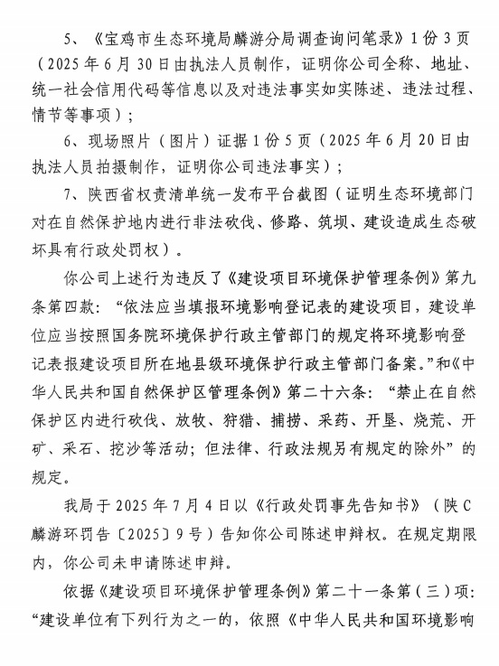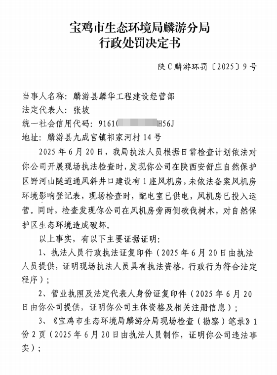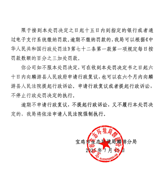 宝鸡市生态环境局麟游分局 行政处罚决定书 陕C麟游环罚〔2025〕9号