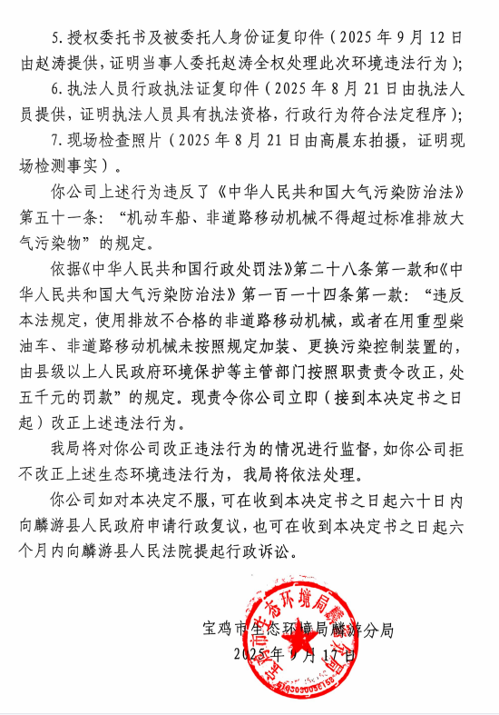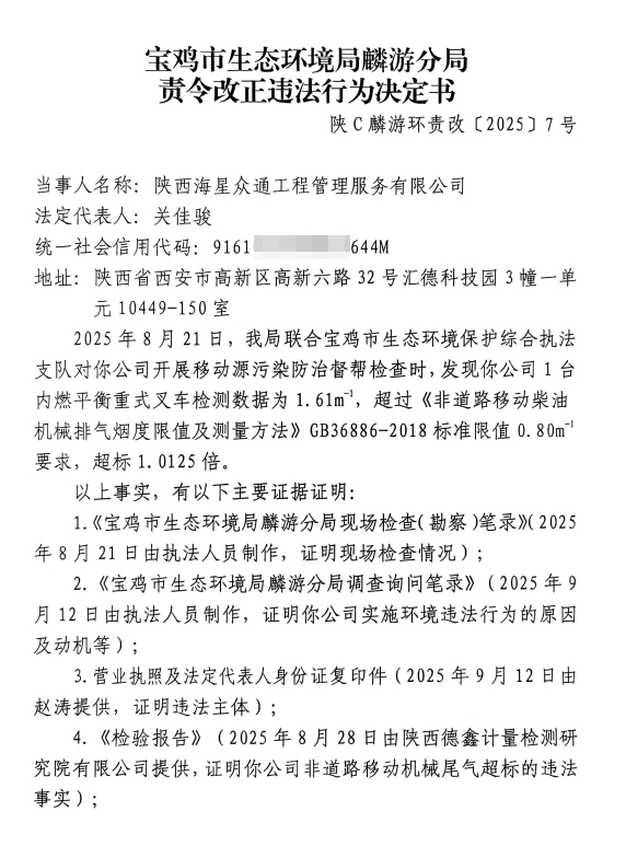 宝鸡市生态环境局麟游分局 责令改正违法行为决定书 陕C麟游环责改〔2025〕7号