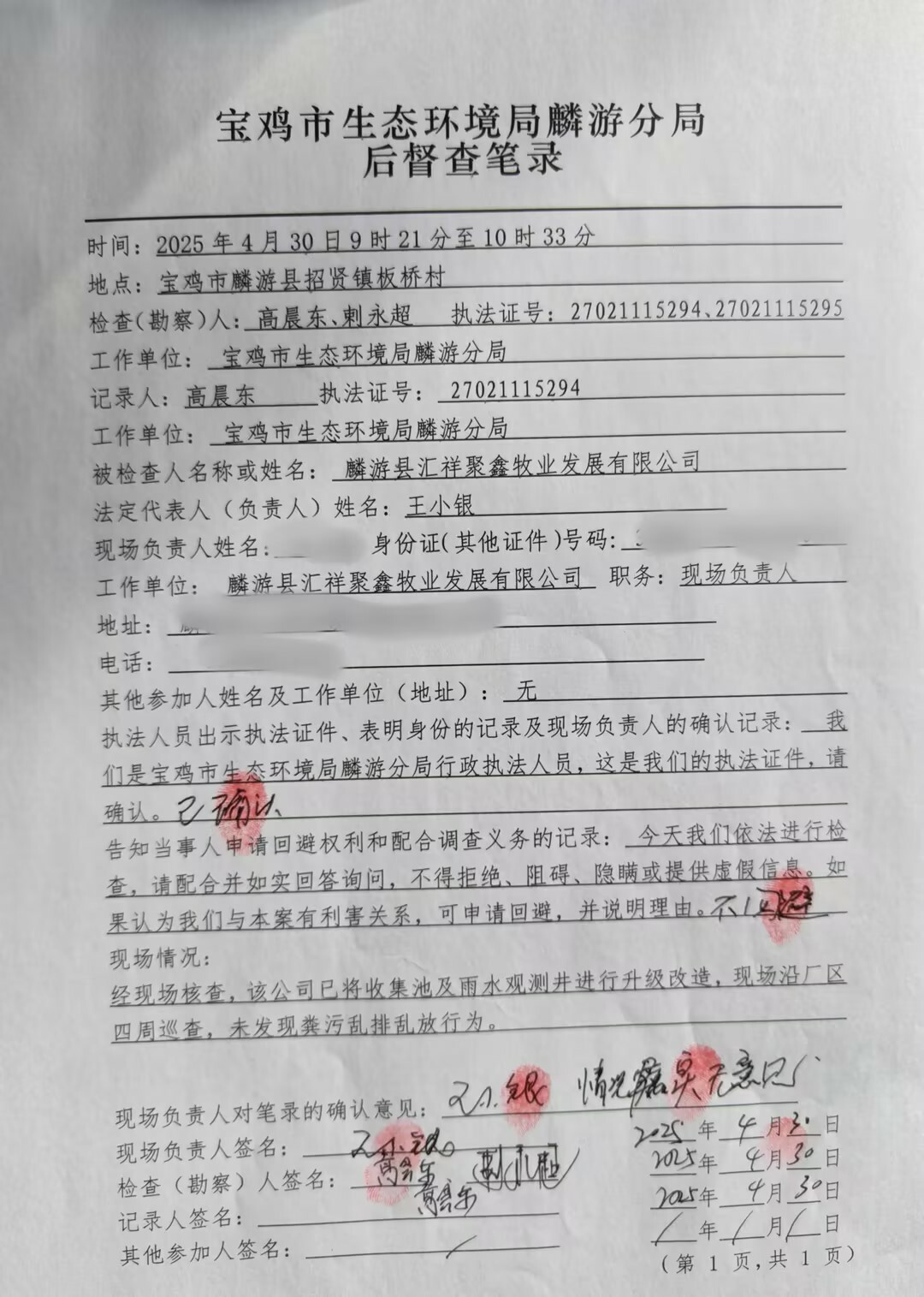 麟游县汇祥聚鑫牧业发展有限公司环境问题整改情况的公示