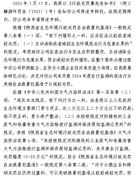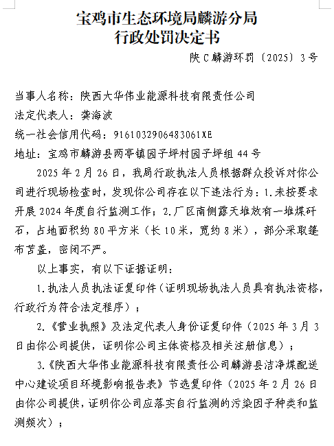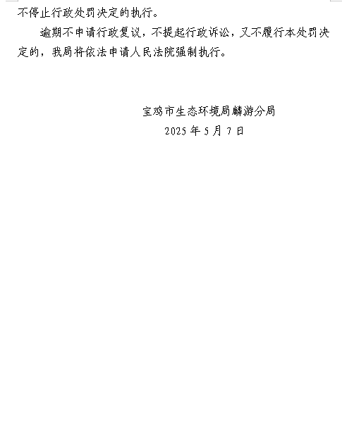 宝鸡市生态环境局麟游分局 行政处罚决定书 陕C麟游环罚〔2025〕3号