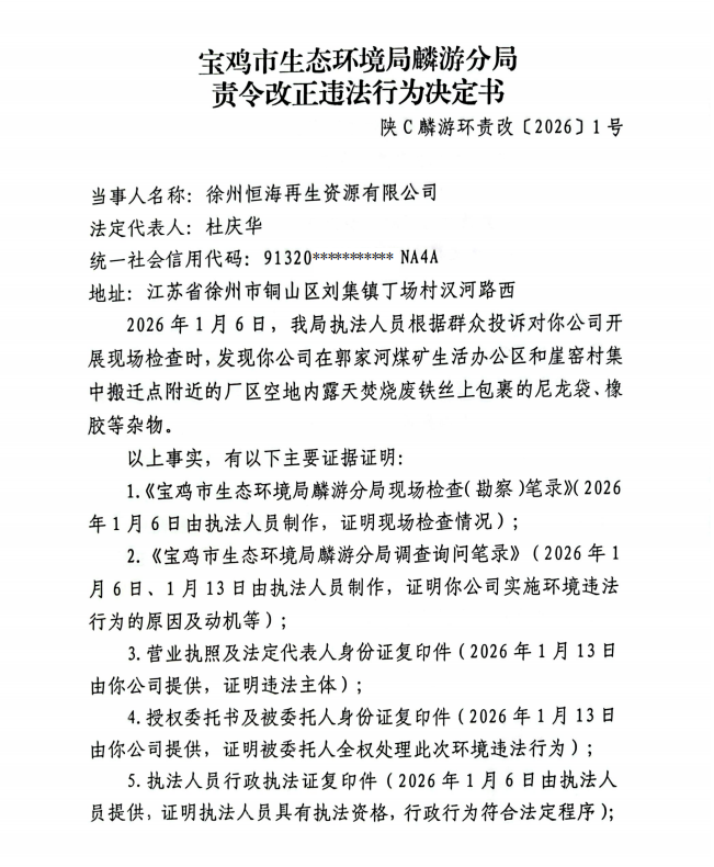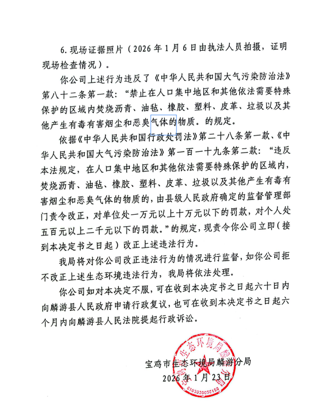 宝鸡市生态环境局麟游分局 责令改正违法行为决定书 陕C麟游环责改〔2026〕1号