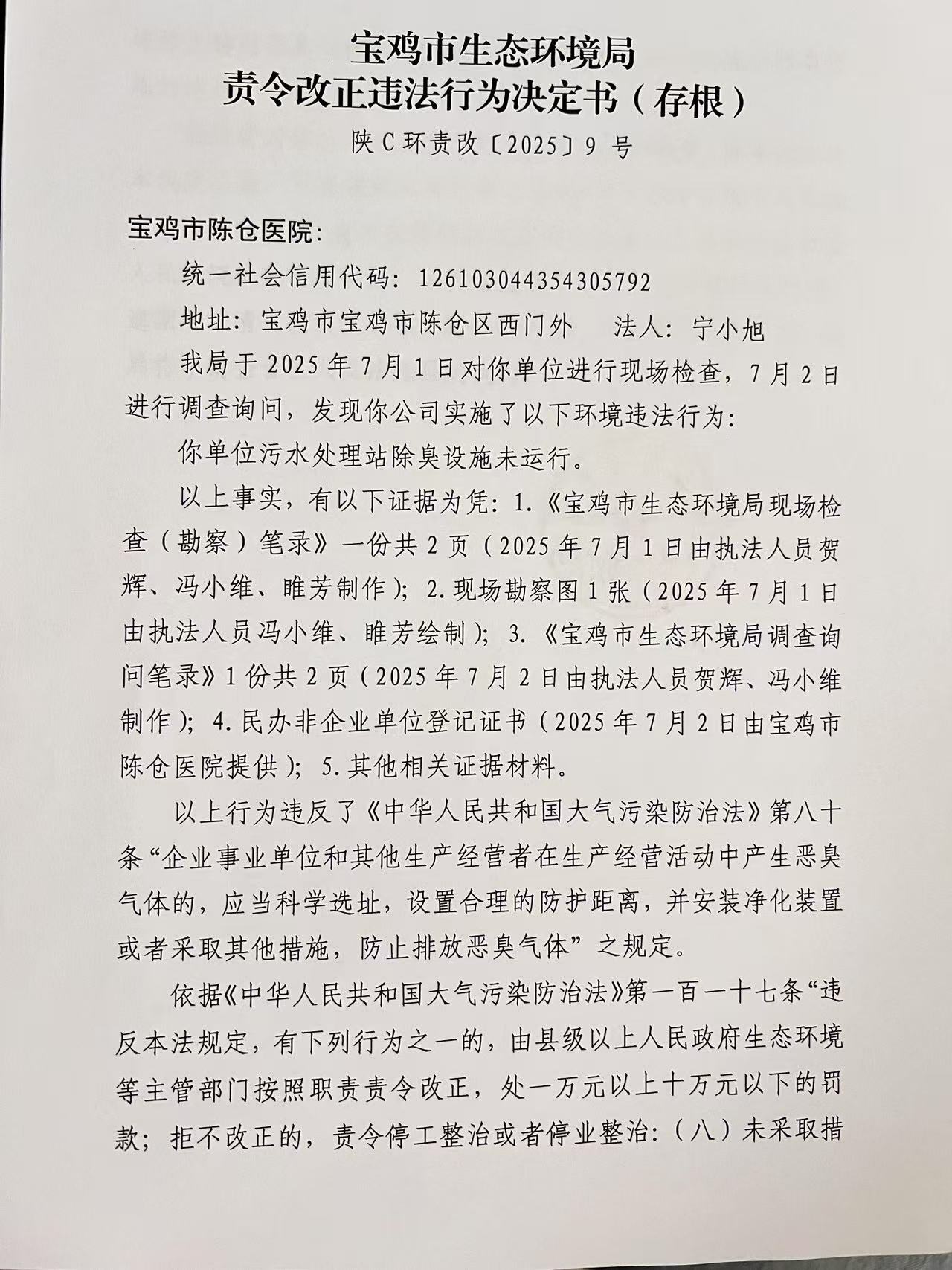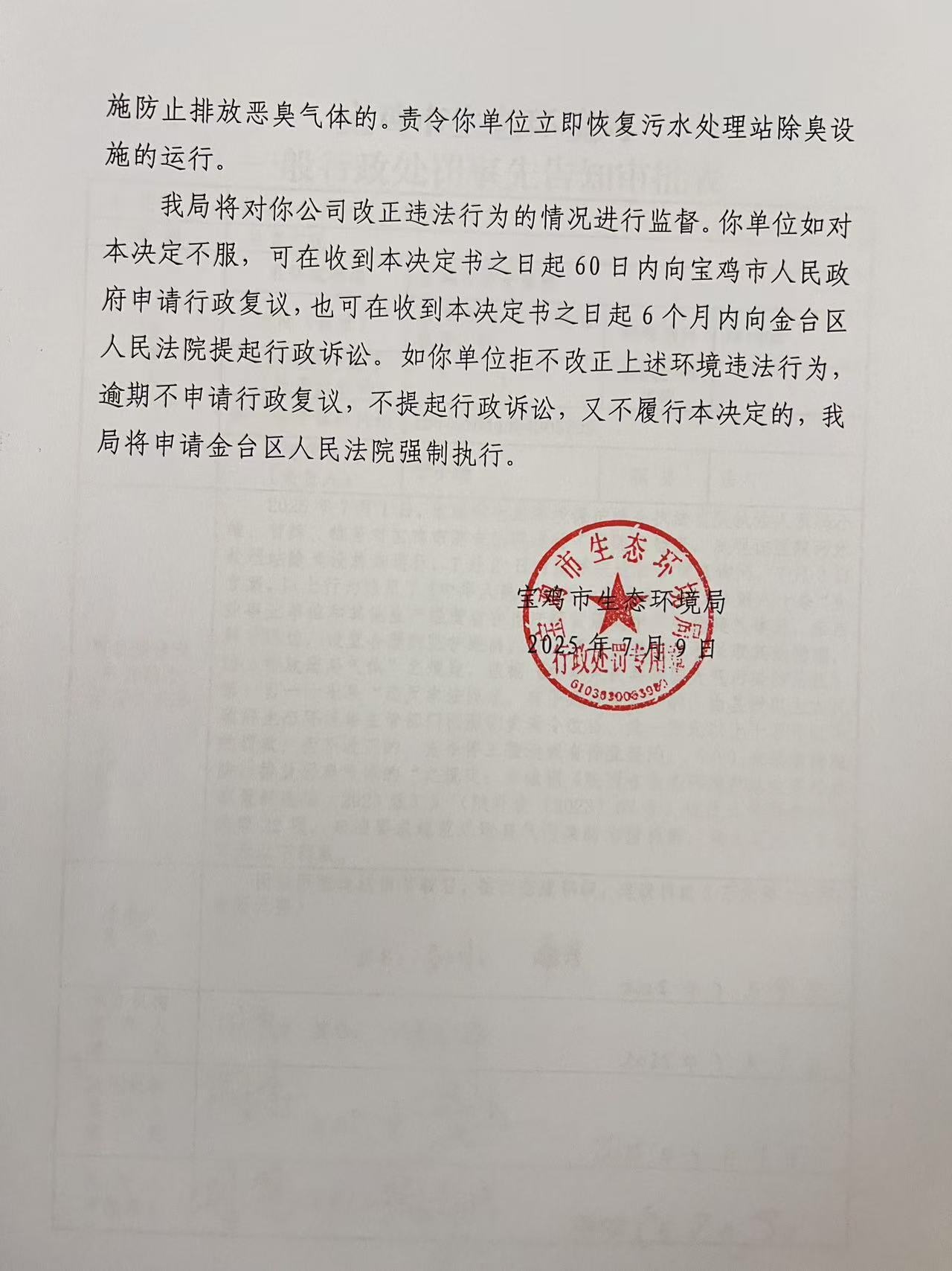 宝鸡市生态环境局 责令改正违法行为决定书 陕C环责改【2025】9号
