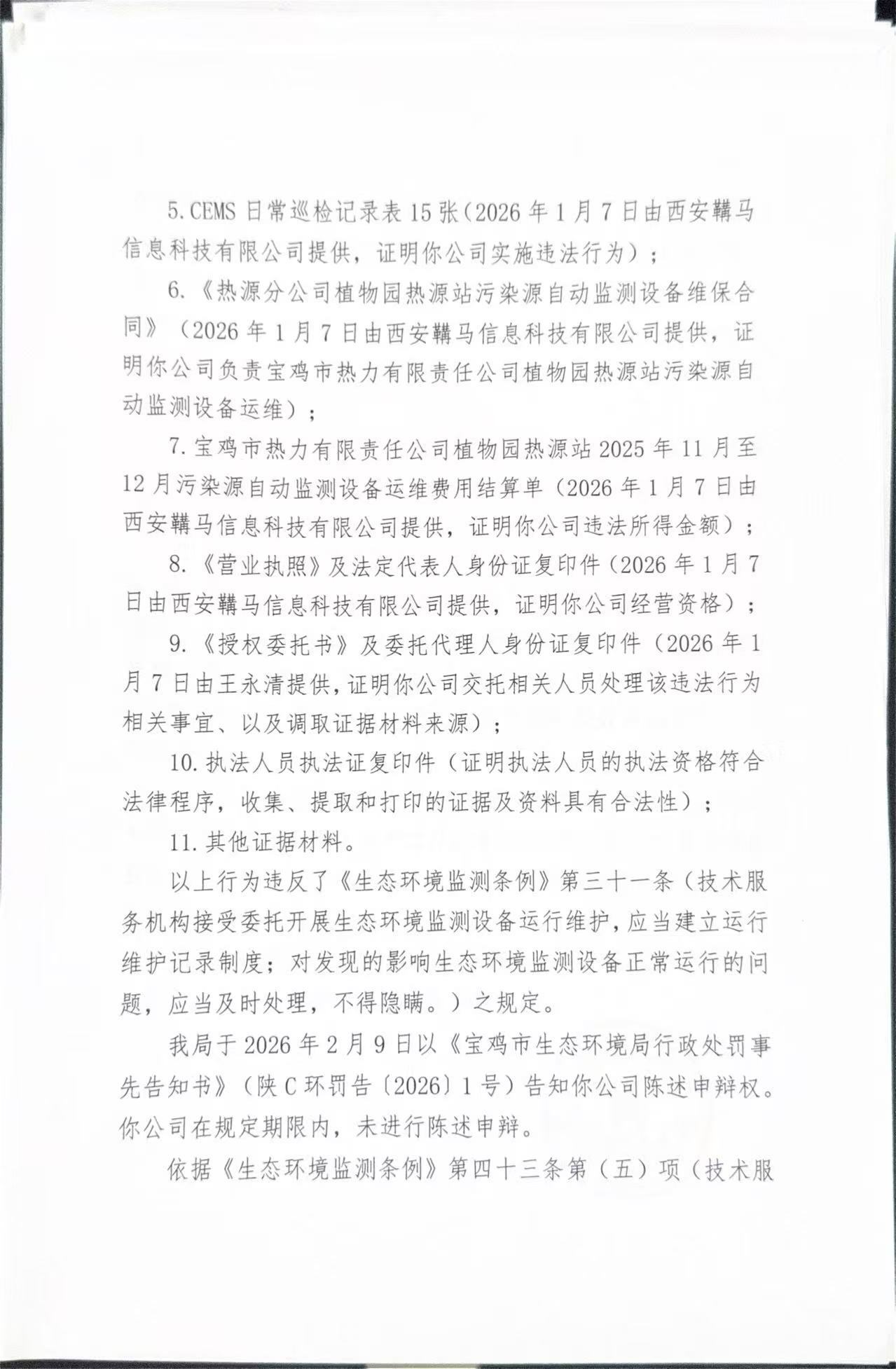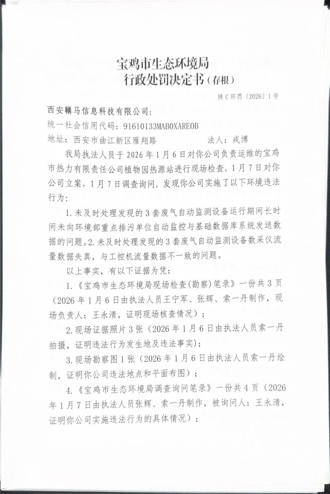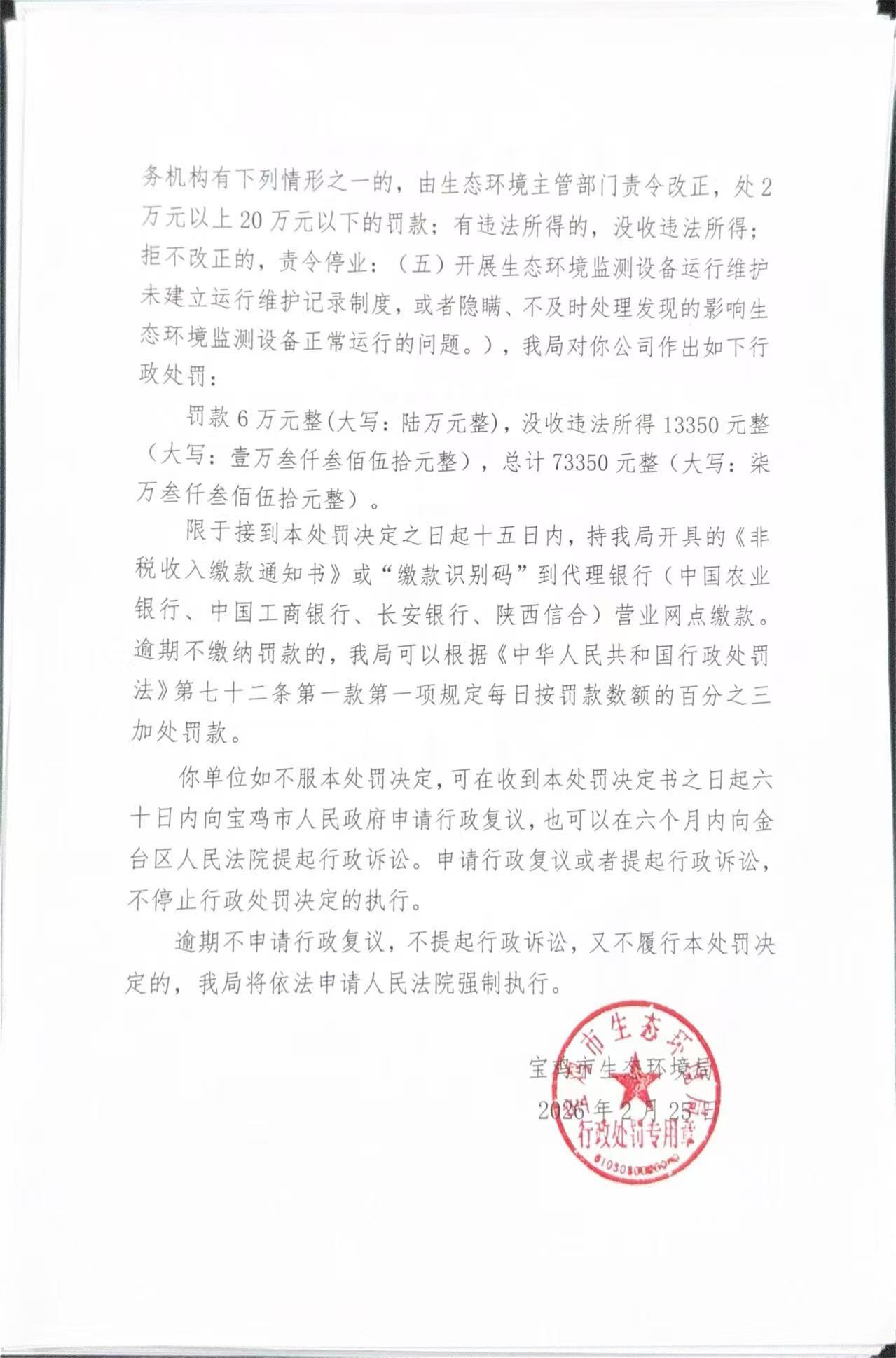 宝鸡市生态环境局行政处罚决定书 陕C环罚[2026]1号
