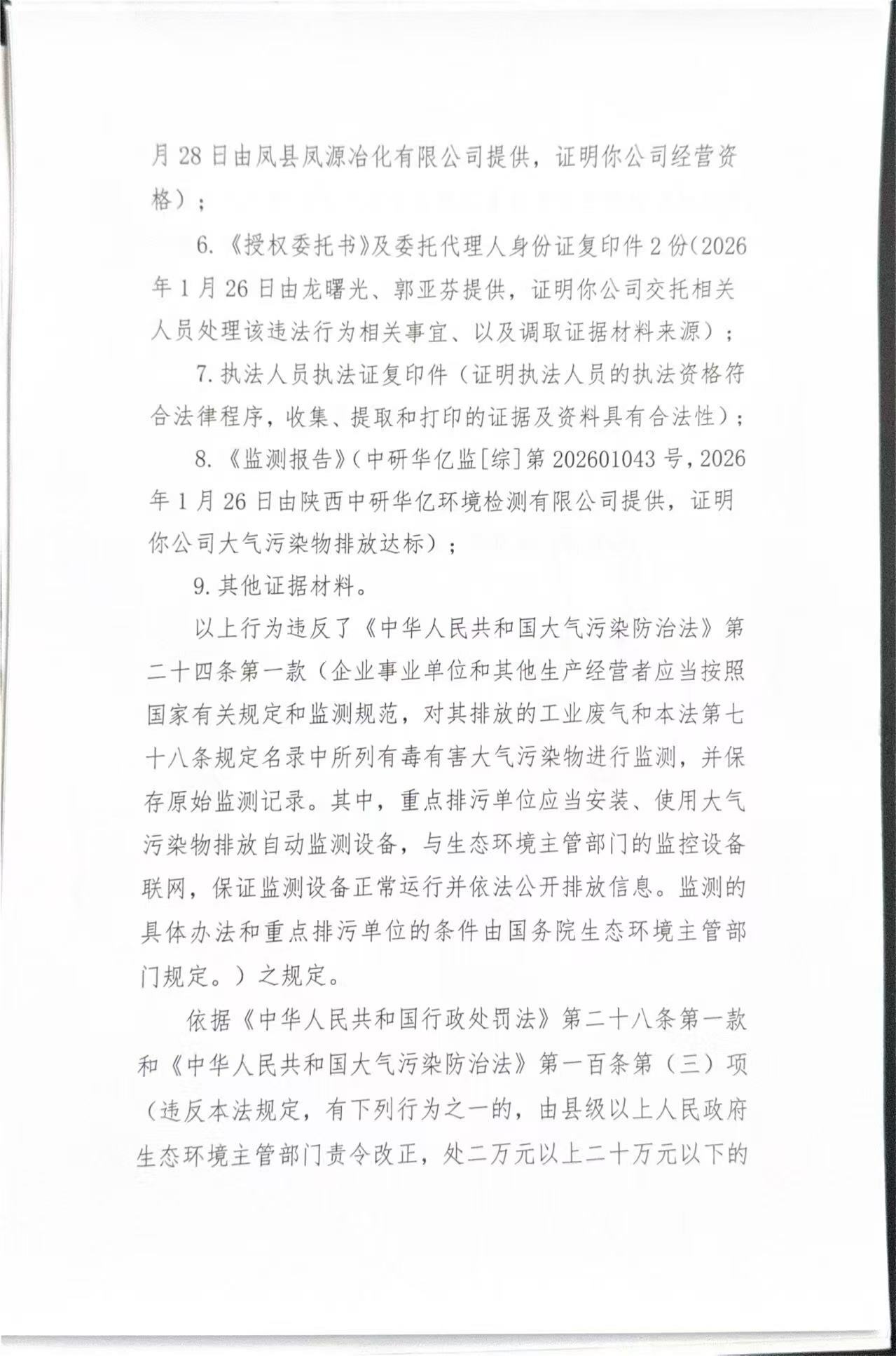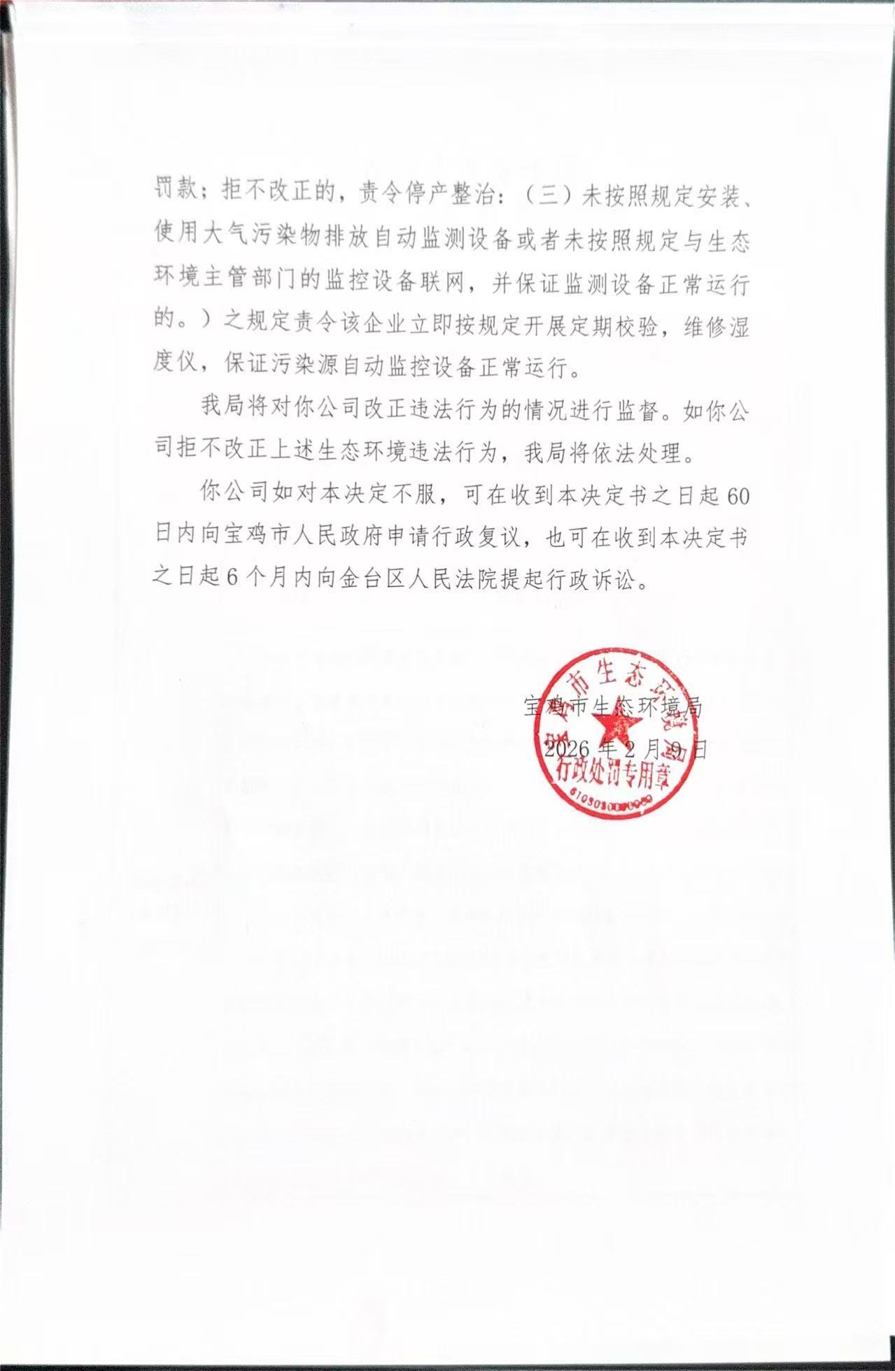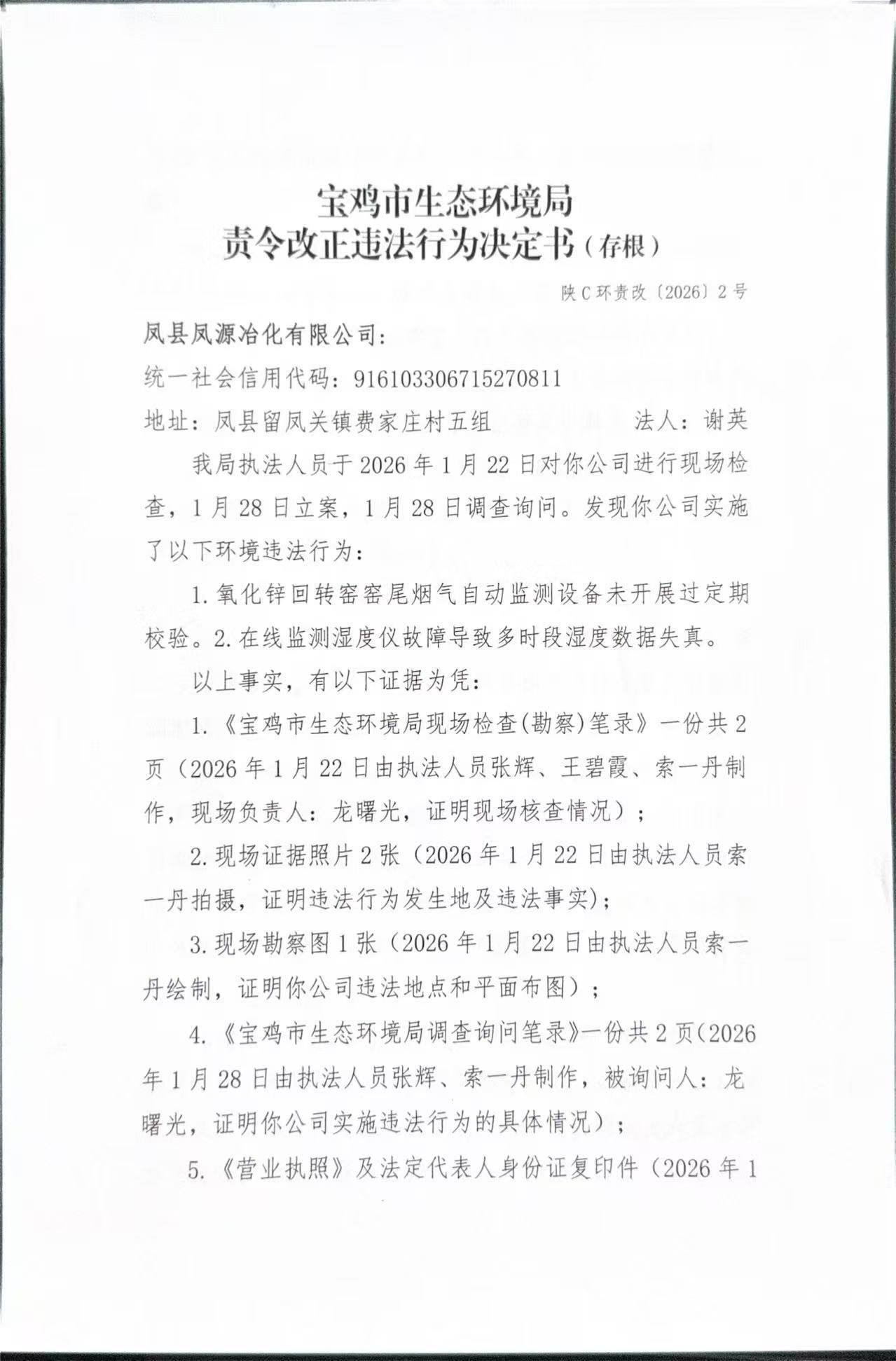 宝鸡市生态环境局责令改正违法行为决定书 陕C环责改[2026]2号
