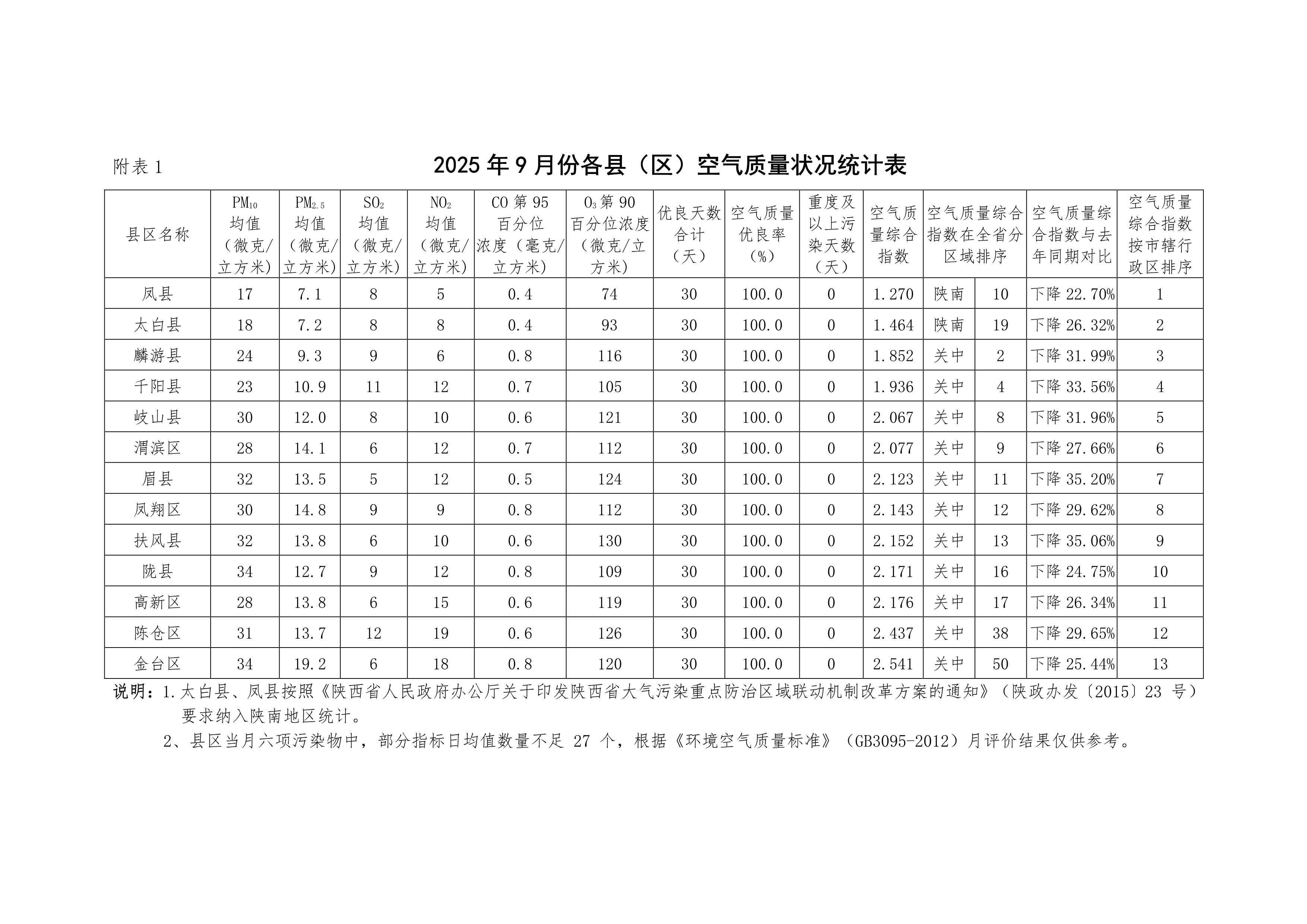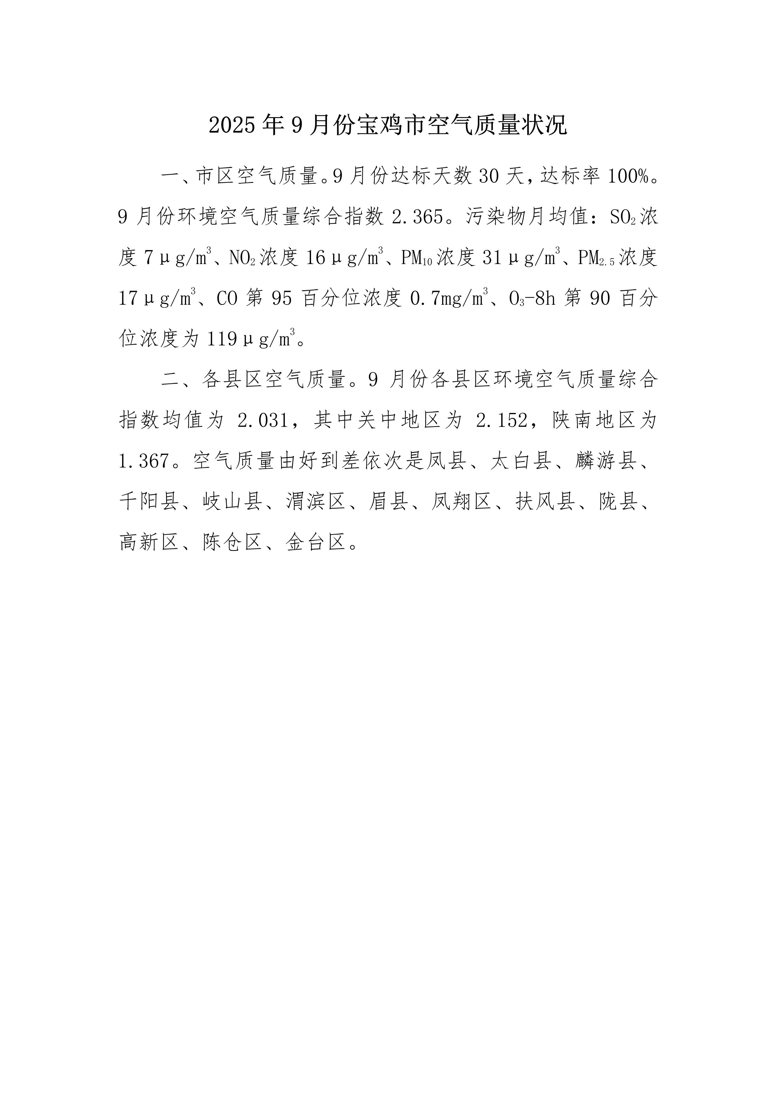 2025年9月份宝鸡市空气质量状况