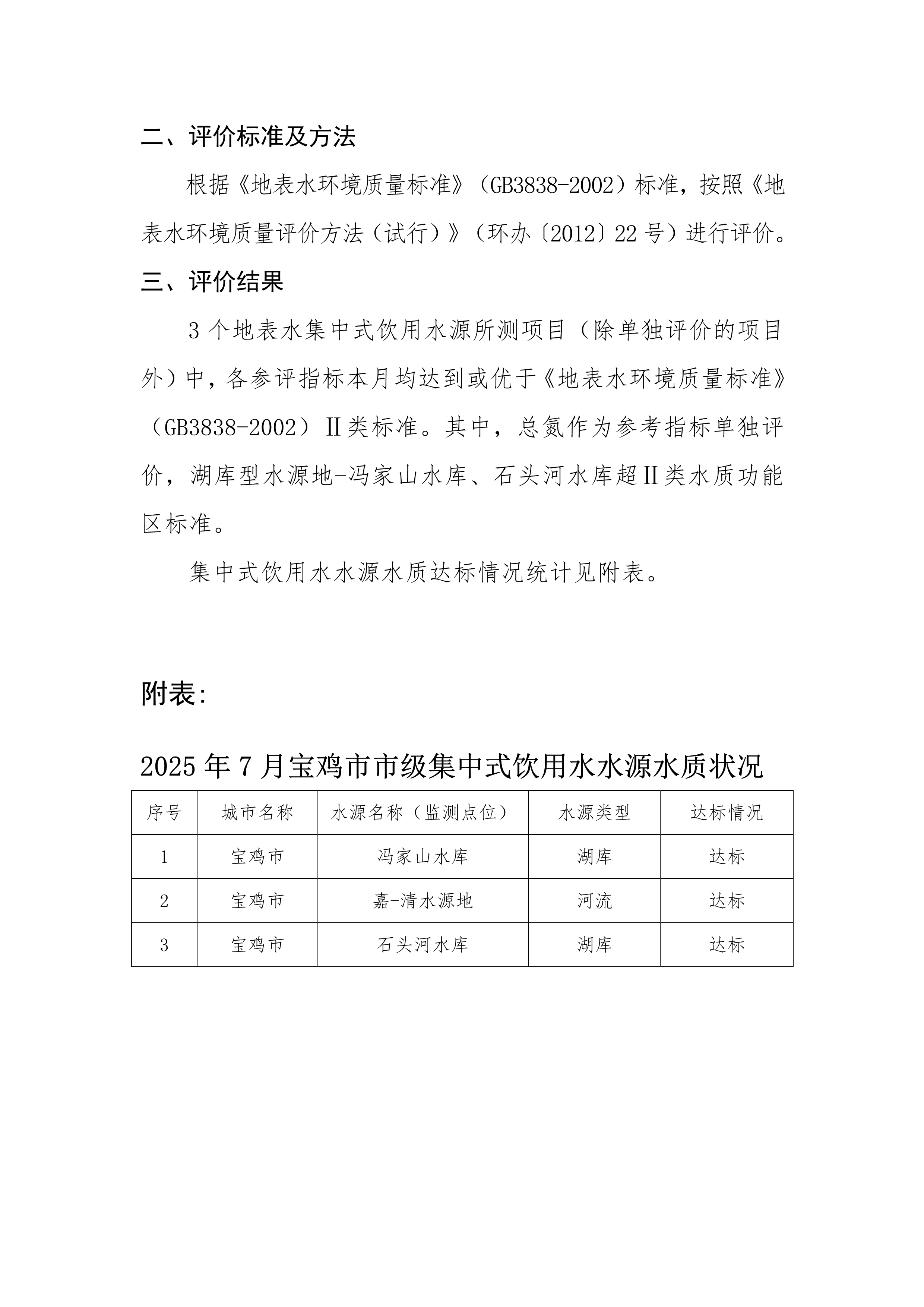 宝鸡市市级国控集中式生活饮用水水源水质状况报告(2025年7月)