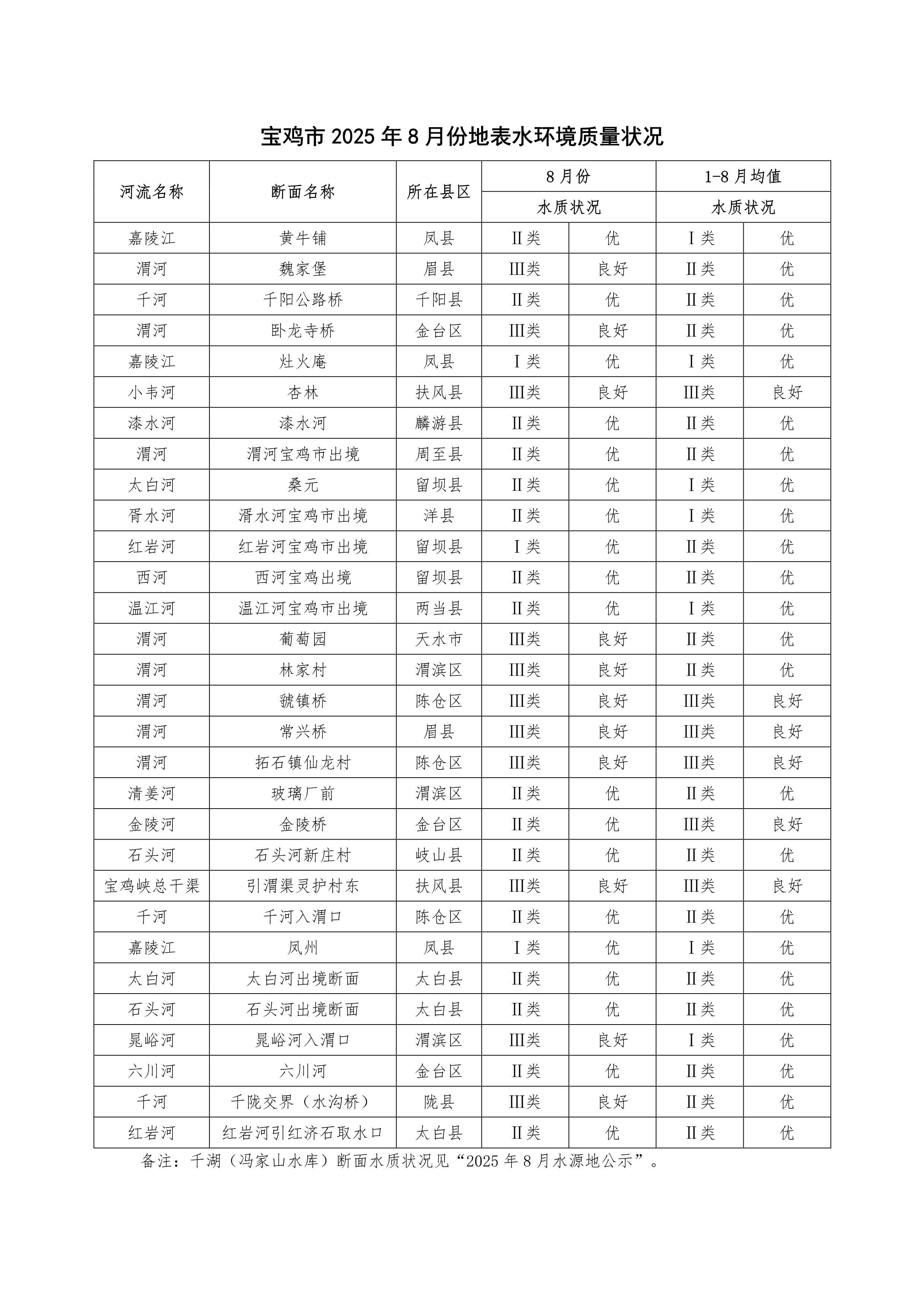 宝鸡市2025年8月份地表水环境质量状况
