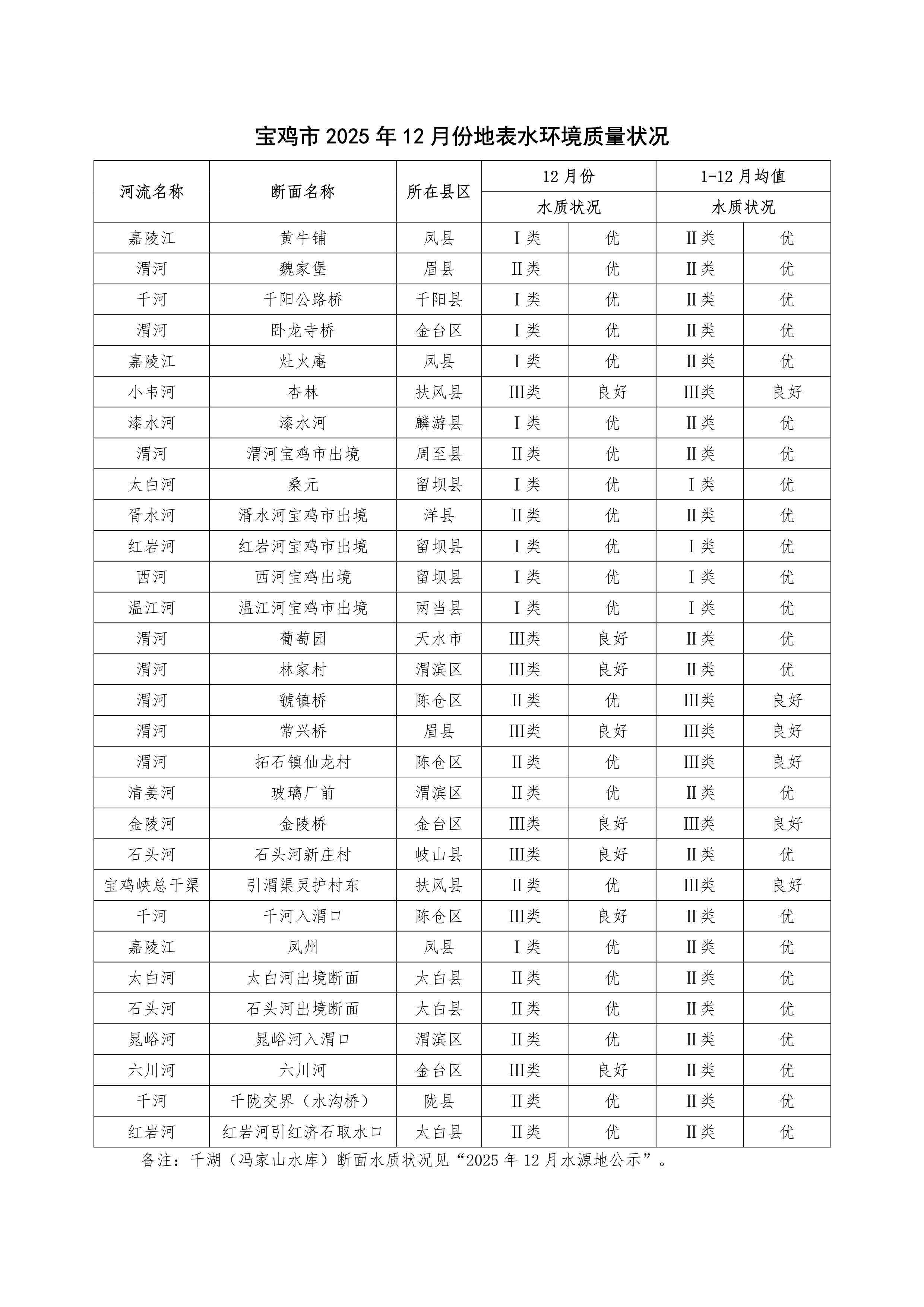 宝鸡市2025年12月份地表水环境质量状况