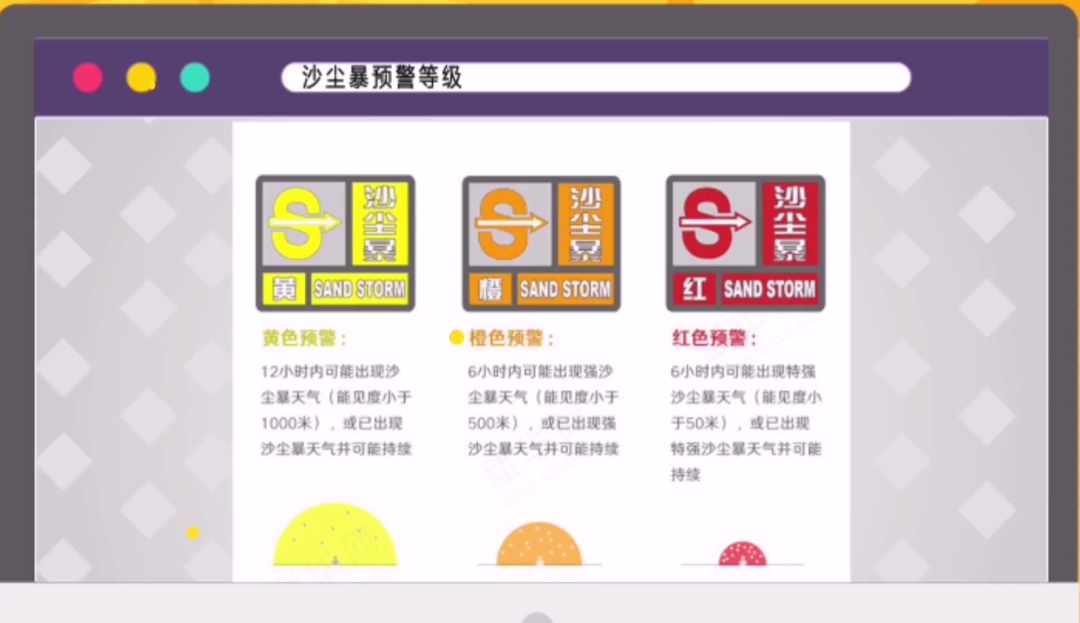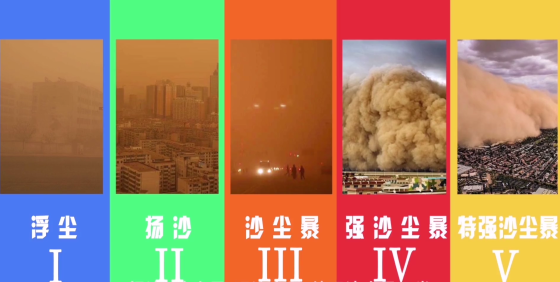 沙尘暴来临前,气象部门会向社会发布预警信息。根据沙尘暴出现时间迟早和强度可分为三级:由弱到强分别以黄、橙、红色表示。