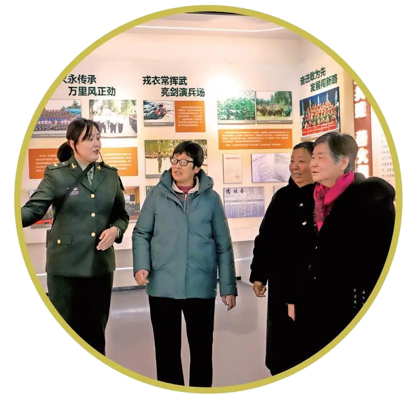 1月3日,在补浪河女子民兵治沙连展览馆,第十五任连长高艺玲(左一)为“老兵”们讲述治沙连的变化。记者 李旭佳摄